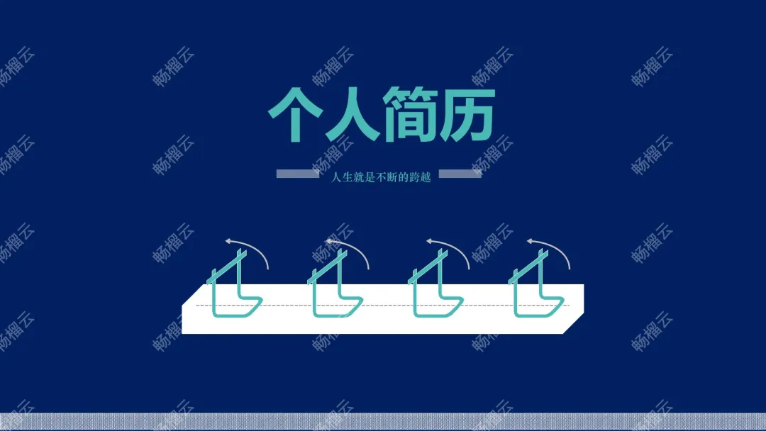 这是一份个人简历PPT演示文稿,整体围绕“人生就是不断的跨越”主题展开,预留了多处可自定义填写内容的区域,可用于展示个人求职相关经历、优势等内容,帮助求职者清晰呈现自身情况,适配求职汇报等场景。