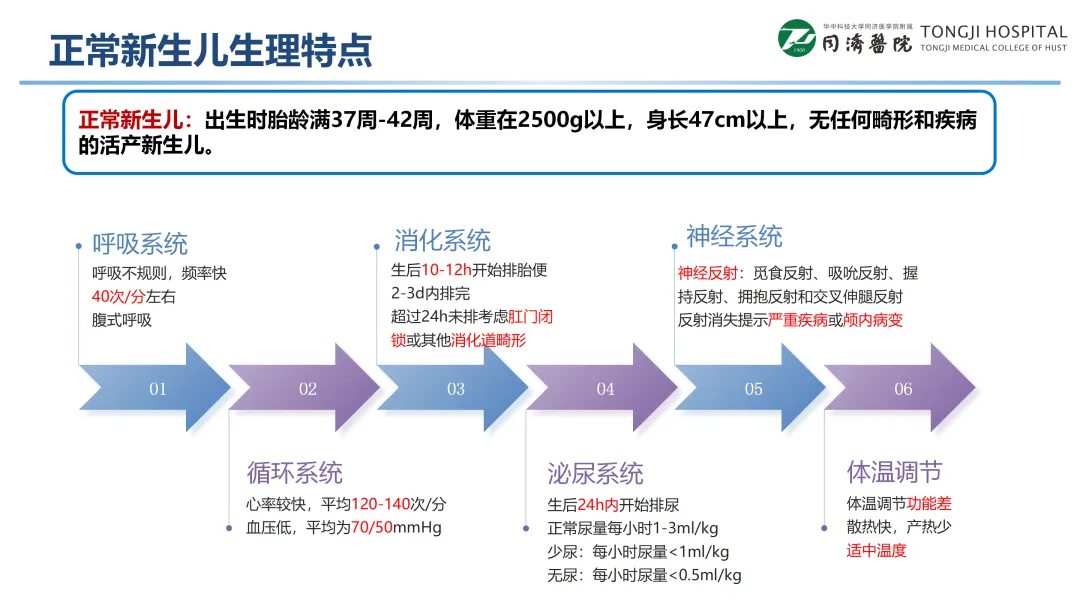 内容首先明确新生儿期界定标准,从胎龄、出生体重、体重与胎龄关系多维度讲解新生儿分类,并清晰界定高危新生儿识别范围,为针对性照护奠定基础。随后详细阐述新生儿呼吸、循环、消化等各系统正常生理指标,区分6种非疾病性特殊生理状态,帮助学习者厘清生理与病理的边界。
