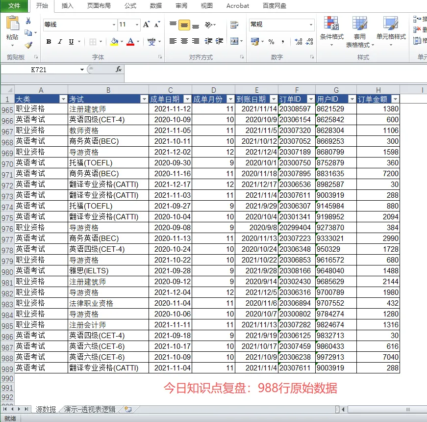 它来自一个考试培训平台,每一行都是一笔课程销售记录: