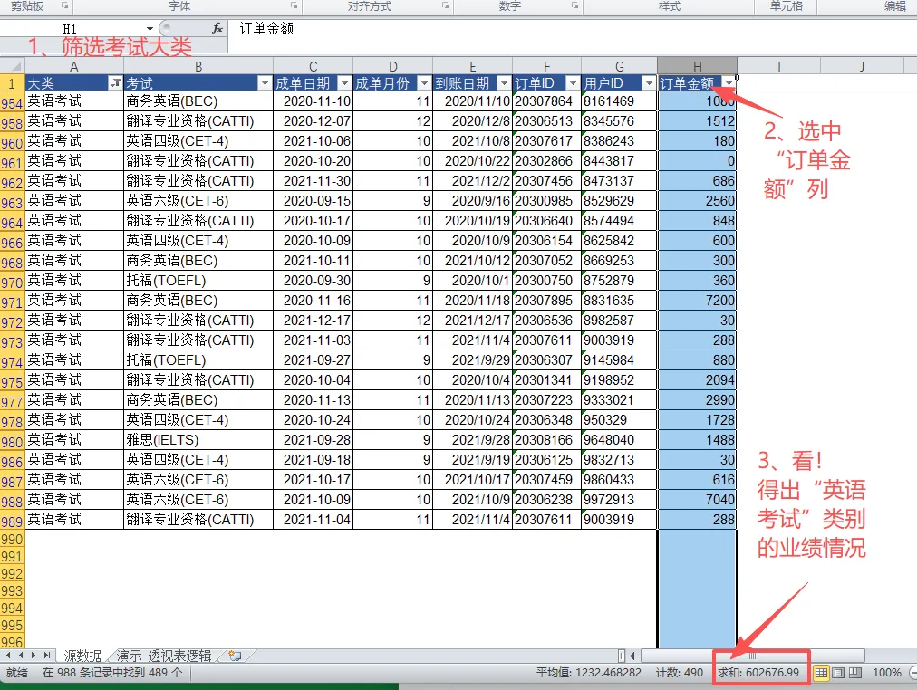 把“订单金额”一列加起来