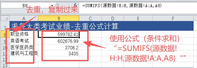 再拖拽填充,把所有考试大类的业绩算完。