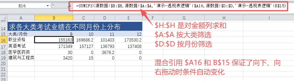 =SUMIFS(源数据!$H:$H,源数据!$A:$A,'演示-透视表逻辑'!$A16,源数据!$D:$D,'演示-透视表逻辑'!B$15)