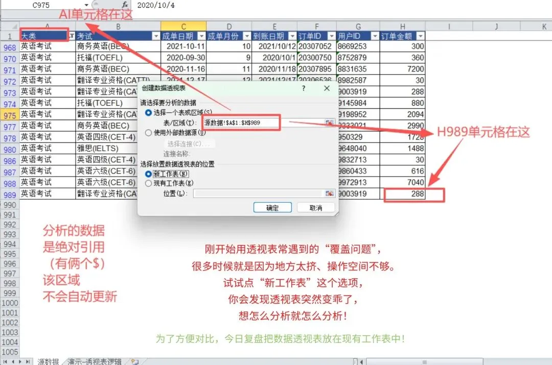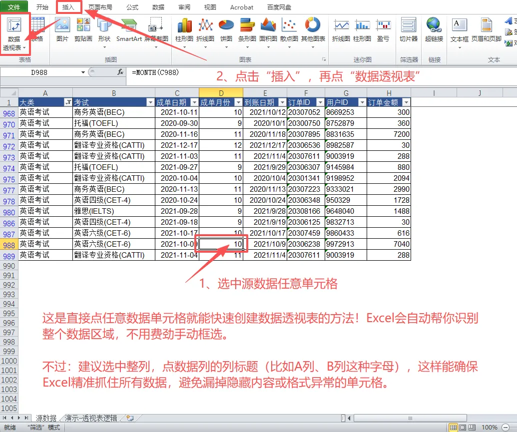 📌 标题行不能有留空;原始数据应避免合并单元格,否则透视表结果会出错,且不会有报错提醒