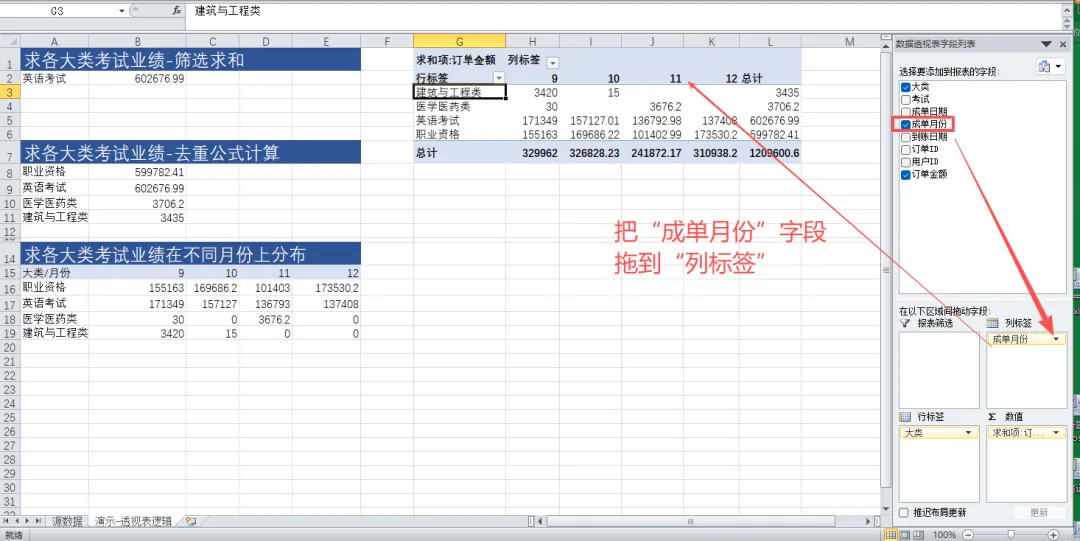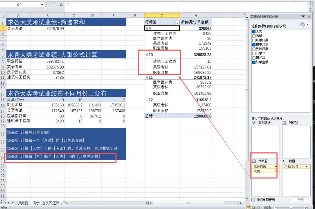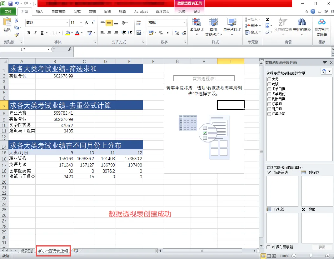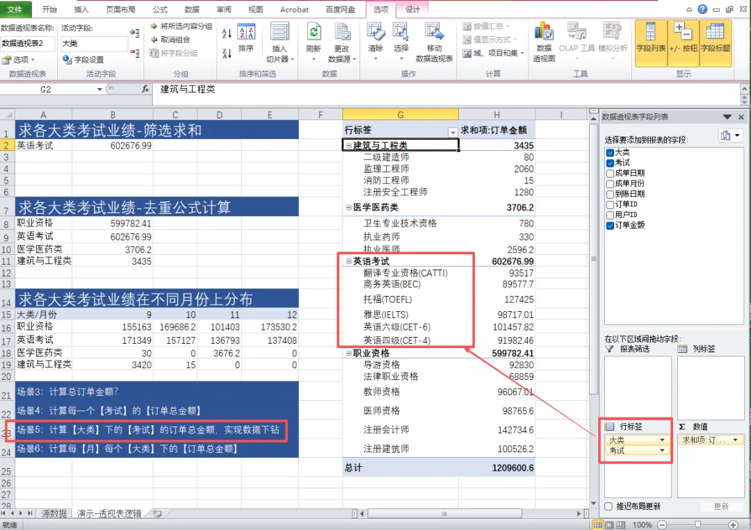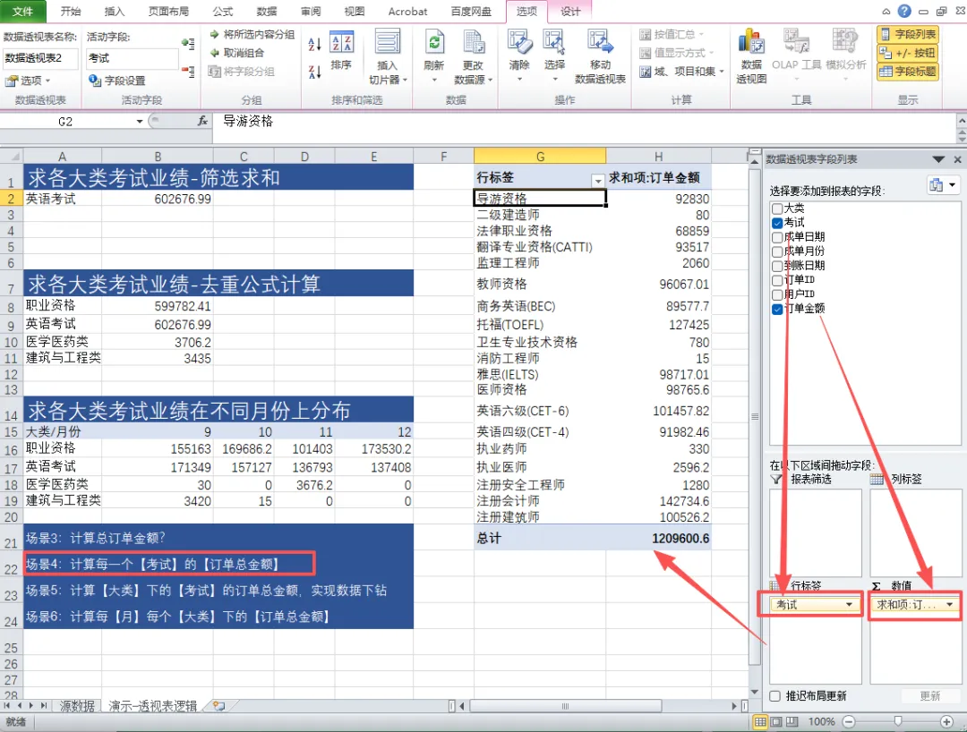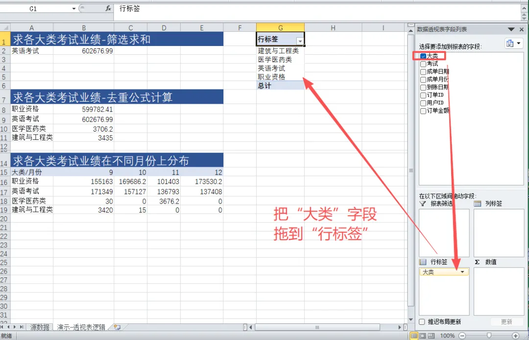 🔹 行 / 列:你想分析的维度(比如按考试大类、按月份)🔹 值:你要计算的指标(比如业绩求和、订单数量、平均值)