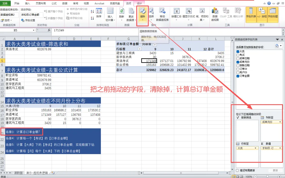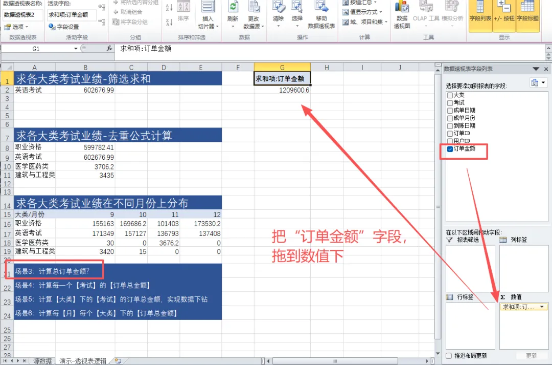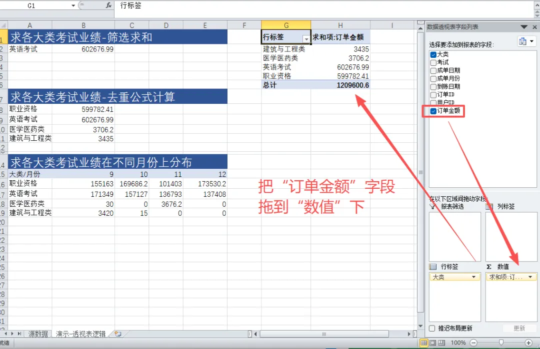 先把之前拖进去的东西清掉,再把“订单金额”拖到值区域(求和)