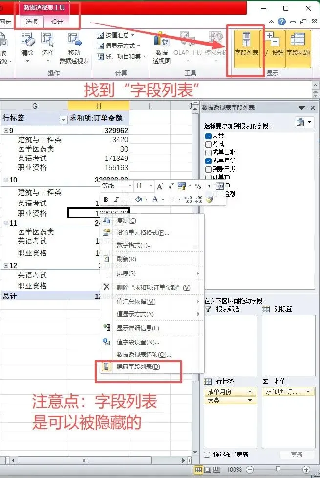 方法1:先点透视表任意单元格(确保它被选中);看Excel最上面的菜单栏,找到「数据透视表工具」的「选项」(选中透视表后才会出现;版本不一样叫法不一样);点一下这个选项卡,找「字段列表」按钮,点它!