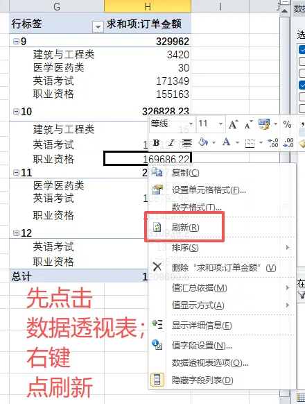 右键点击透视表 → 选择“刷新”,或者在数据透视表选项菜单中点击“刷新”,否则新数据不会同步!