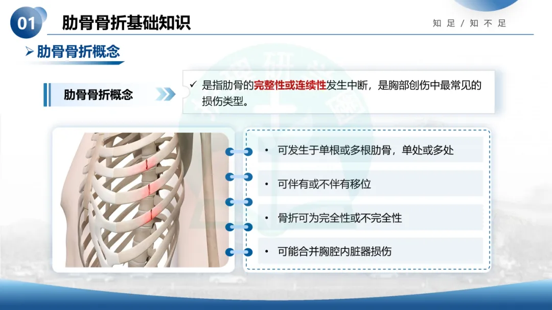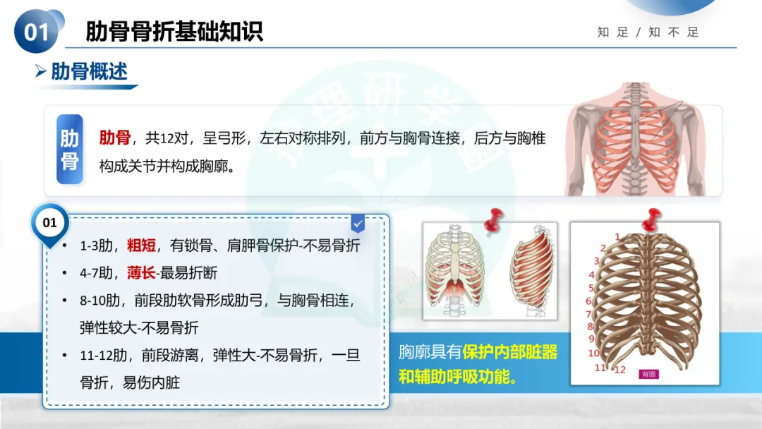 肋骨共12对,4-7肋最易骨折,11-12肋骨折易伤及内脏。肋骨骨折是胸部创伤最常见损伤,指肋骨完整性 / 连续性中断,分单根 / 多根、单处 / 多处,可伴移位与内脏损伤。