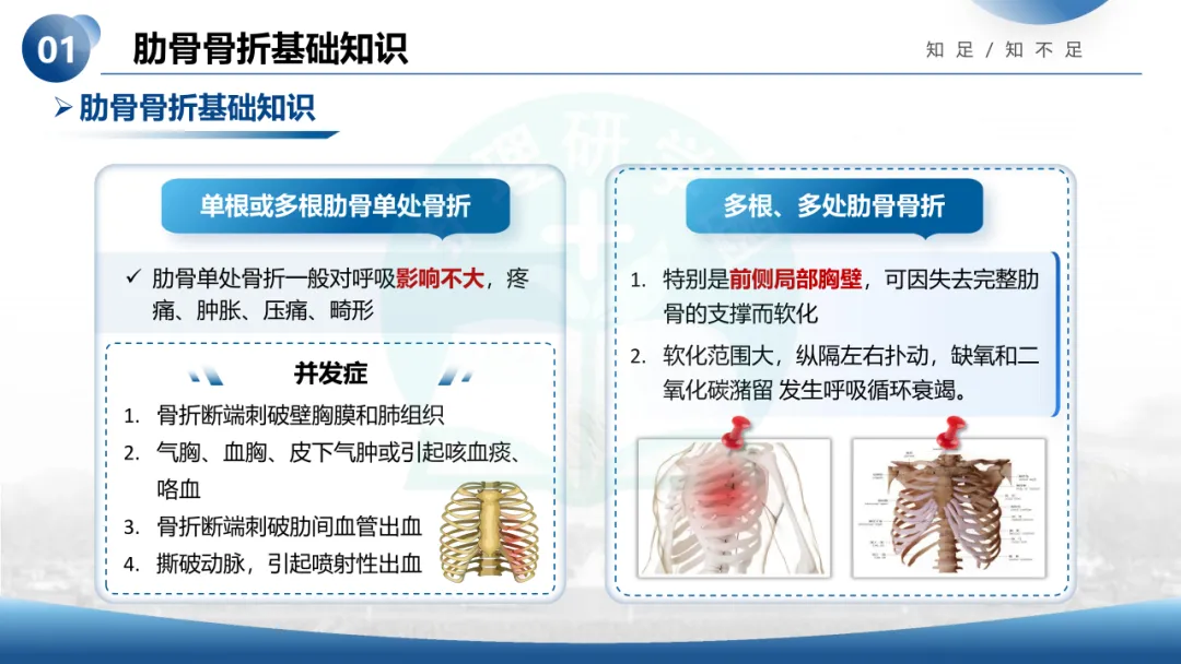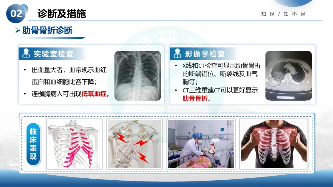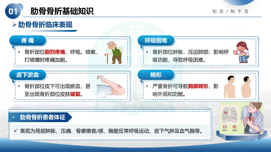 典型表现:局部剧痛(呼吸 / 咳嗽加重)、呼吸困难、皮下淤血、胸廓畸形,可闻骨摩擦音。