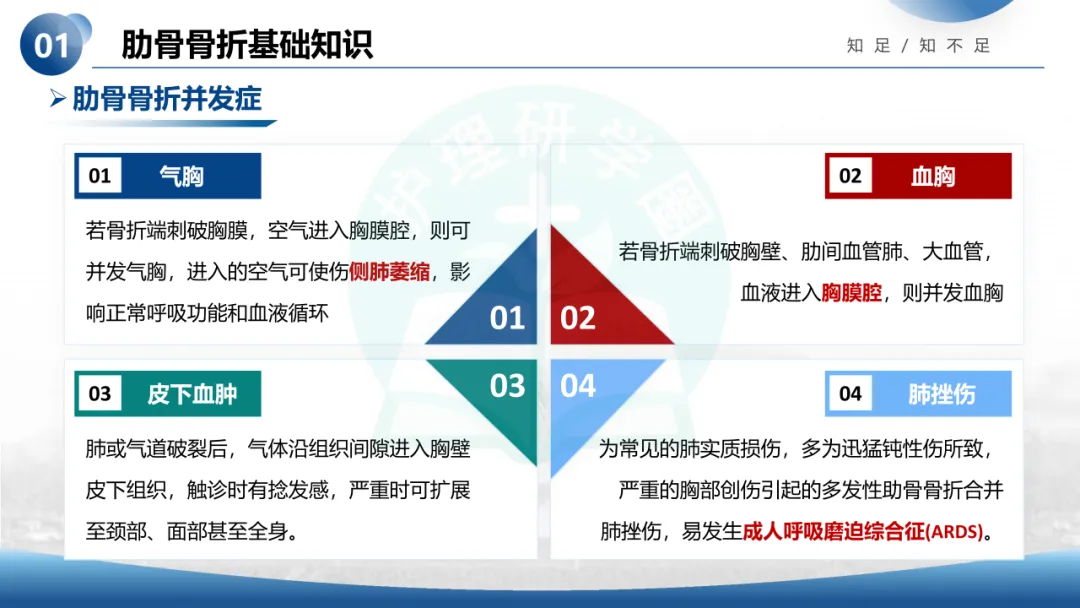 单处骨折:以疼痛、肿胀、压痛为主,对呼吸影响较小,可能并发气胸、血胸、皮下气肿、肋间血管出血。