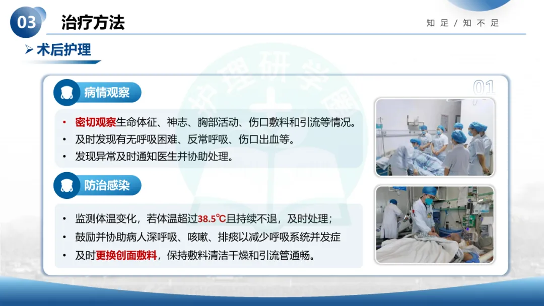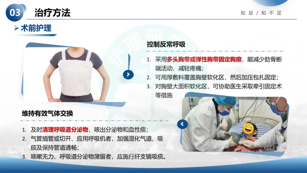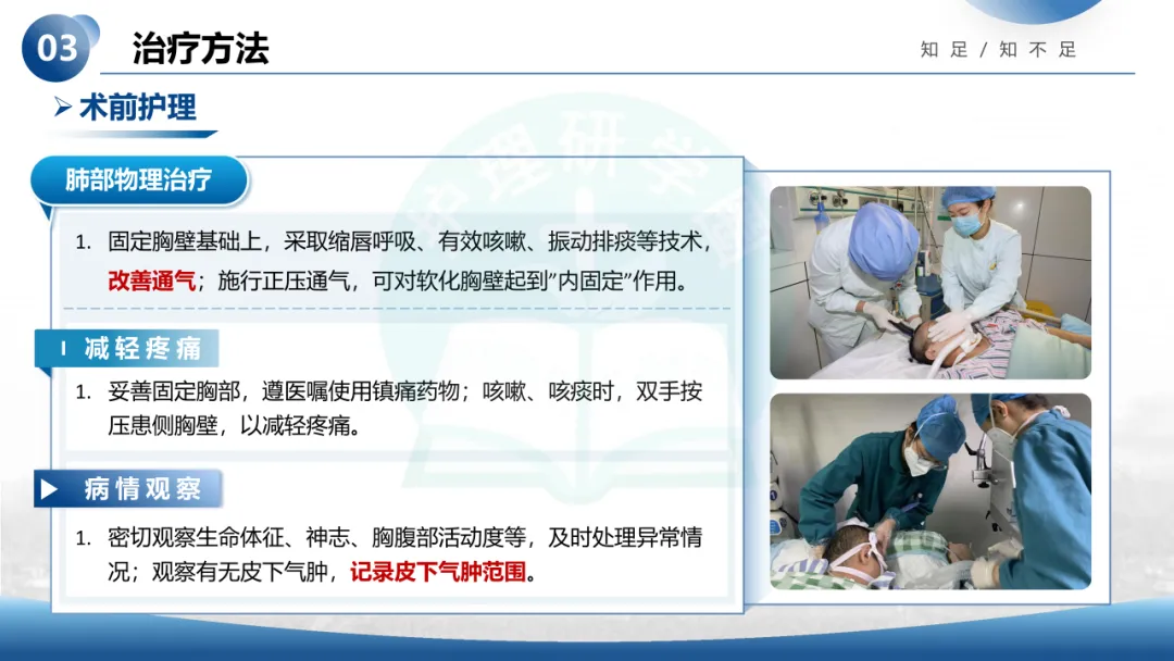 术前护理:控制反常呼吸、维持气体交换、镇痛护理,密切监测🧐生命体征与皮下气肿变化。
