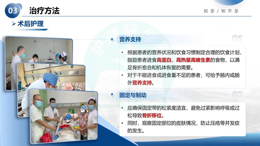 术后护理:持续病情观察。防治感染。高蛋白 / 高热量 / 高维生素营养支持。妥善固定,松紧适宜,预防压疮与移位。