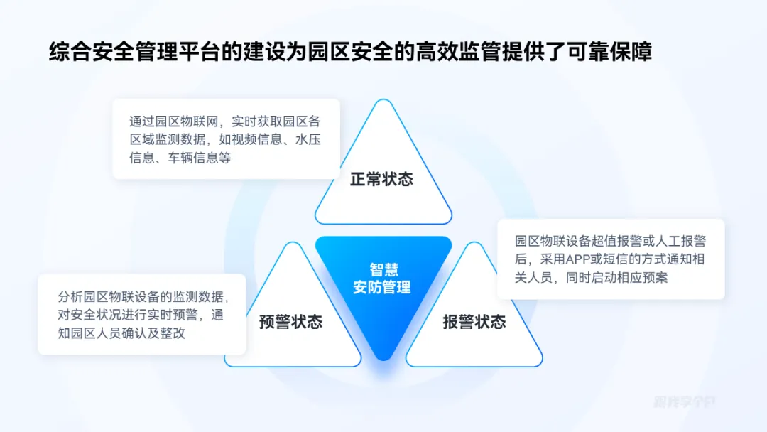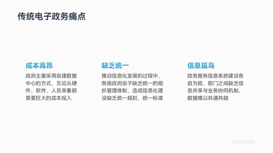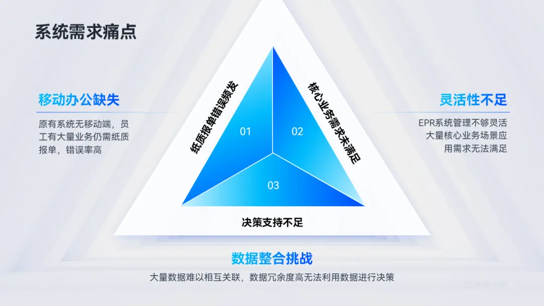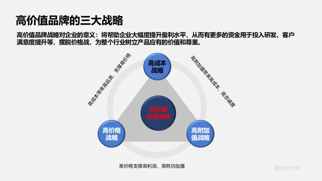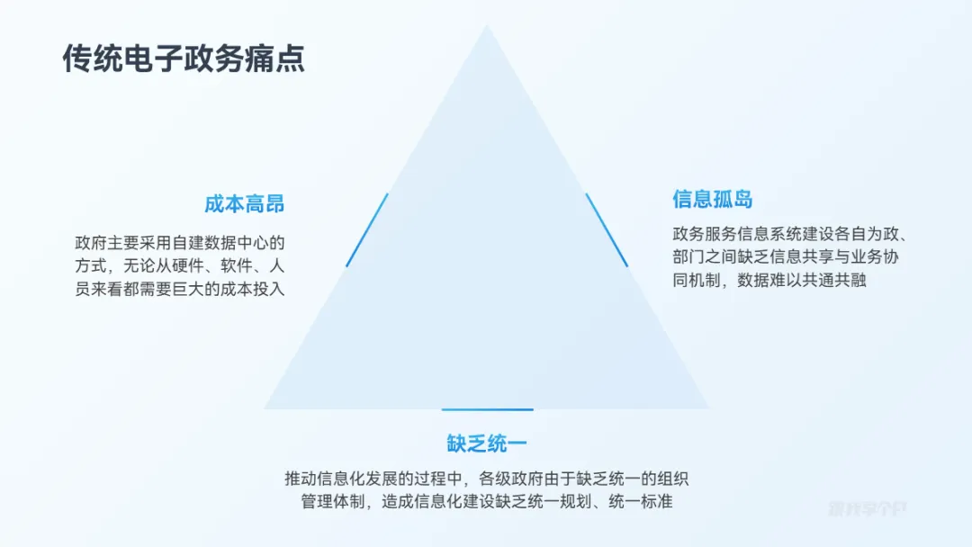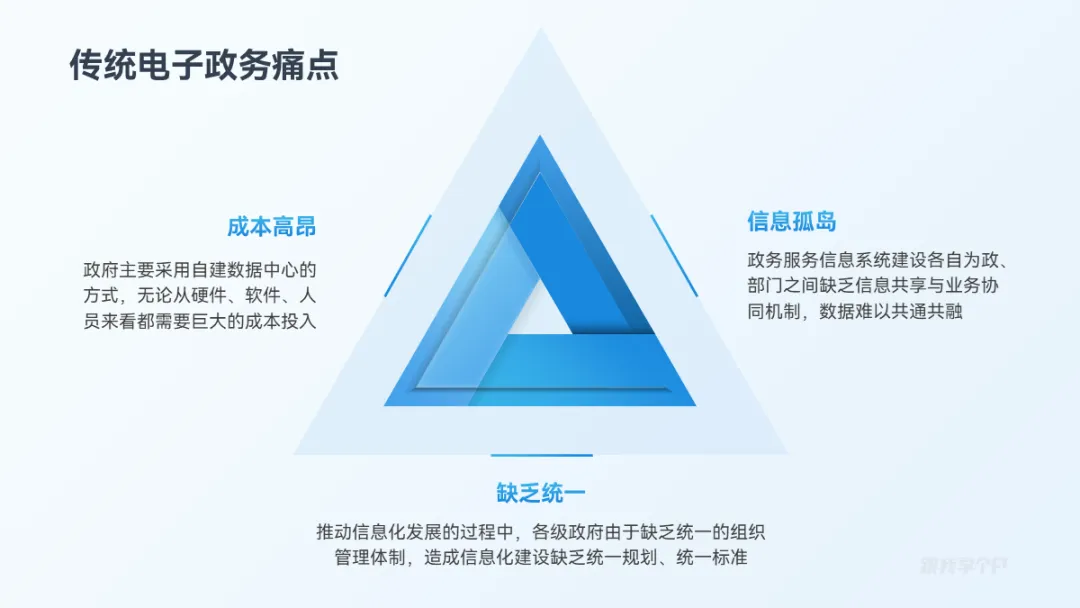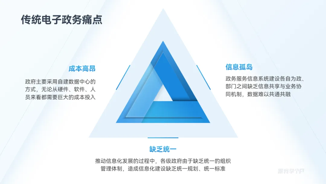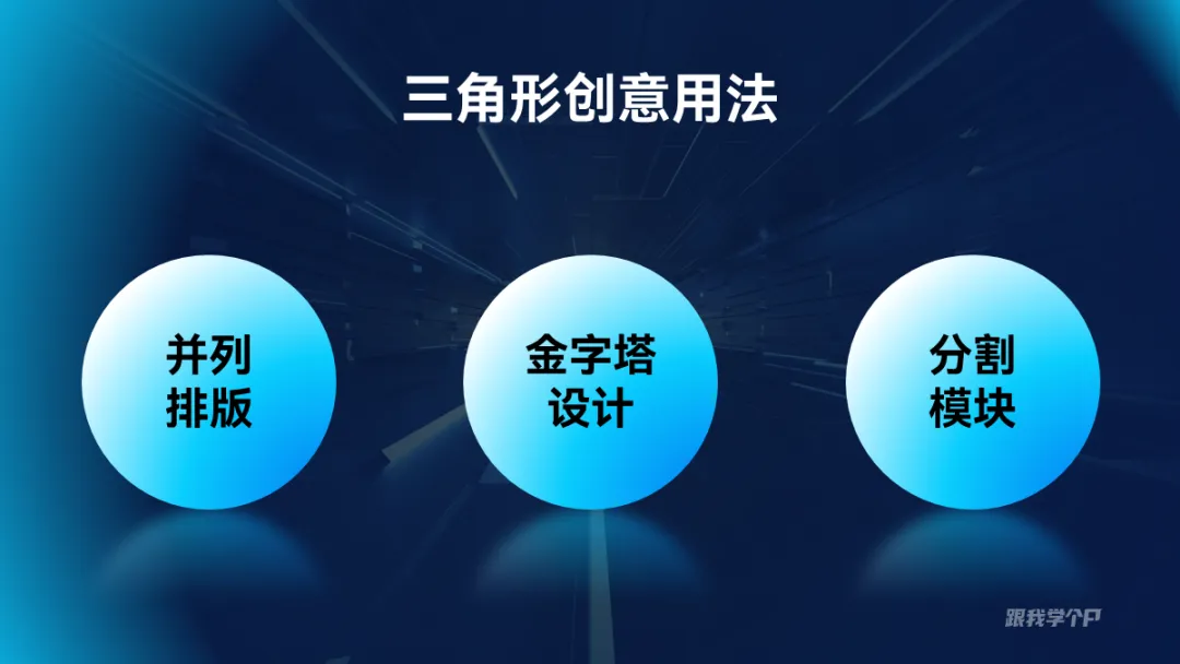 三段并列关系的内容,除了一字排开,用三角形来排版会更有创意,比如这页: