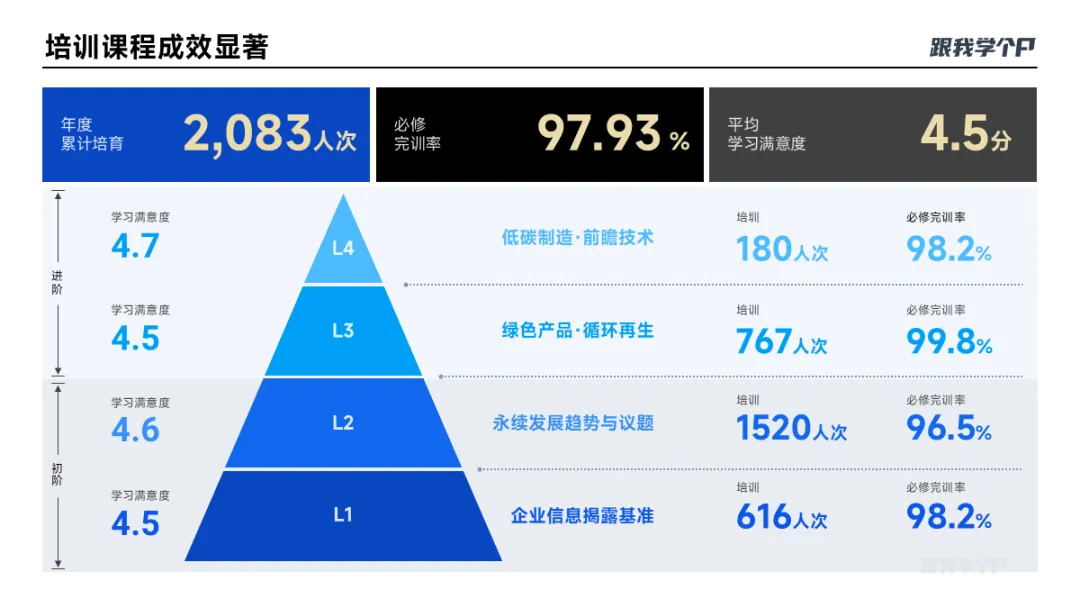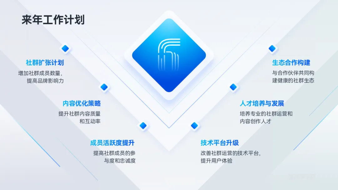 还有这页,用六边布局成三角阵,再叠加三角形丰富视觉,更有层次。