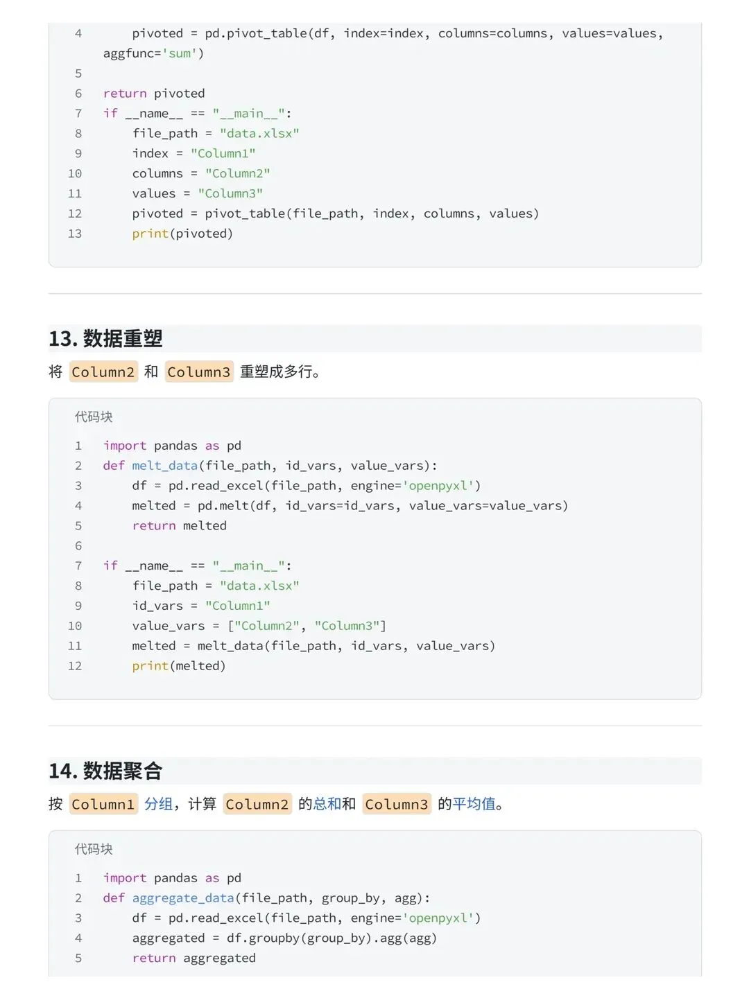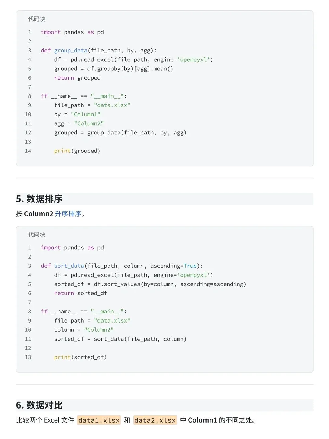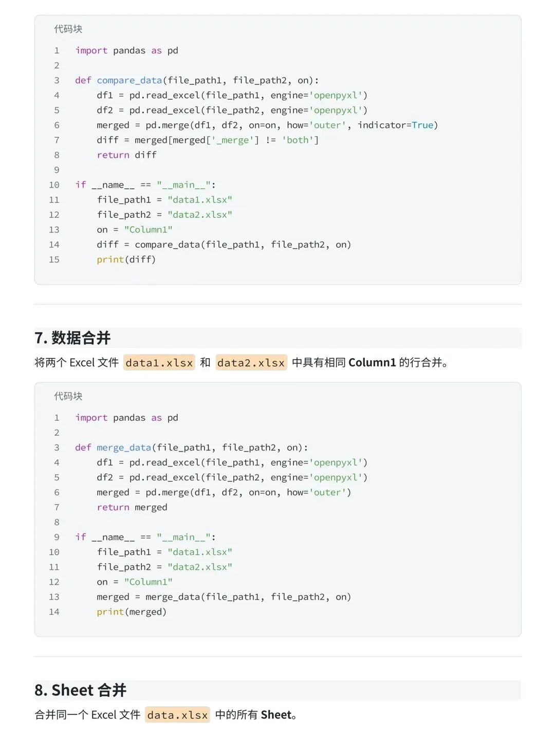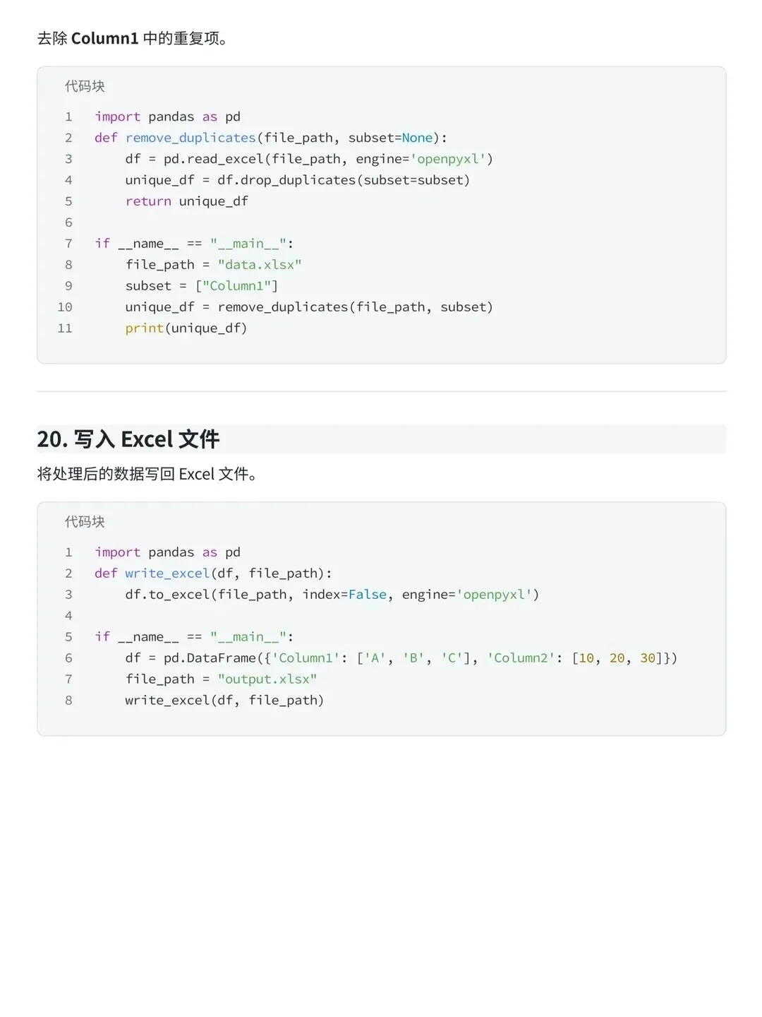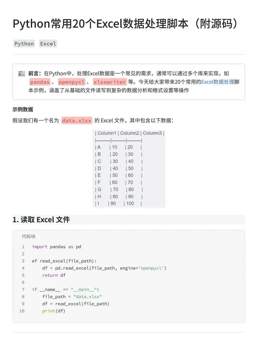 20 个 Python 常用 Excel 数据处理脚本,涵盖表格读写、合并拆分、去重清洗、数据匹配、批量制表,办公自动化、报表生成直接套用,大幅提升做表效率。