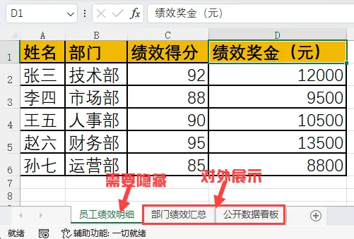 假设我们有一个 Excel 工作簿,包含 3 个工作表,其中 “员工绩效明细” 包含员工的敏感数据,需要彻底隐藏,而 “部门绩效汇总” 和 “公开数据看板” 是对外展示的公开内容:
