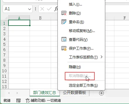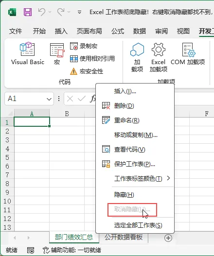 关闭 VBA 编辑器,返回 Excel 工作表界面。此时右键单击工作表标签,你会发现 “取消隐藏” 选项是灰色的,无法点击,彻底隐藏成功!