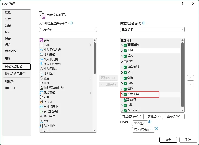 2. 在右侧 “主选项卡” 列表中,勾选【开发者工具】,单击【确定】。