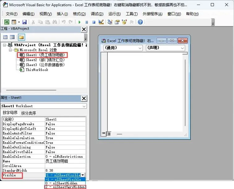 3. 单击 Visible 属性的下拉框,选择 2 - xlSheetVeryHidden。