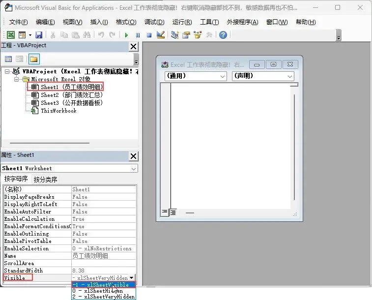 1. 在 VBA 窗口左侧的 “项目 - VBAProject” 面板中,找到并选中你要彻底隐藏的工作表(如 “员工绩效明细”)。