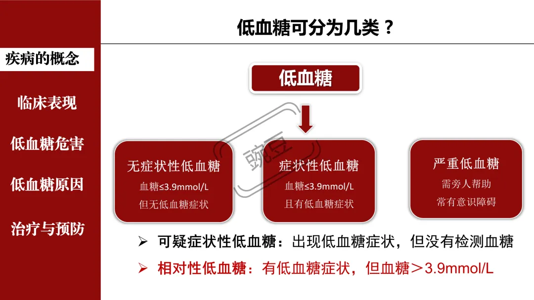 糖尿病患者接受药物治疗的糖尿病患者,血糖<3.9 mmol/L即属于低血糖