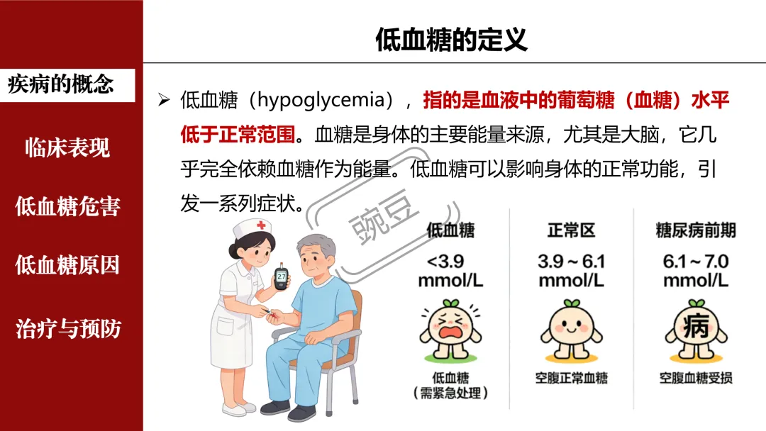 低血糖(hypoglycemia),指的是血液中的葡萄糖(血糖)水平低于正常范围。血糖是身体的主要能量来源,尤其是大脑,它几乎完全依赖血糖作为能量。低血糖可以影响身体的正常功能,引发一系列症状。