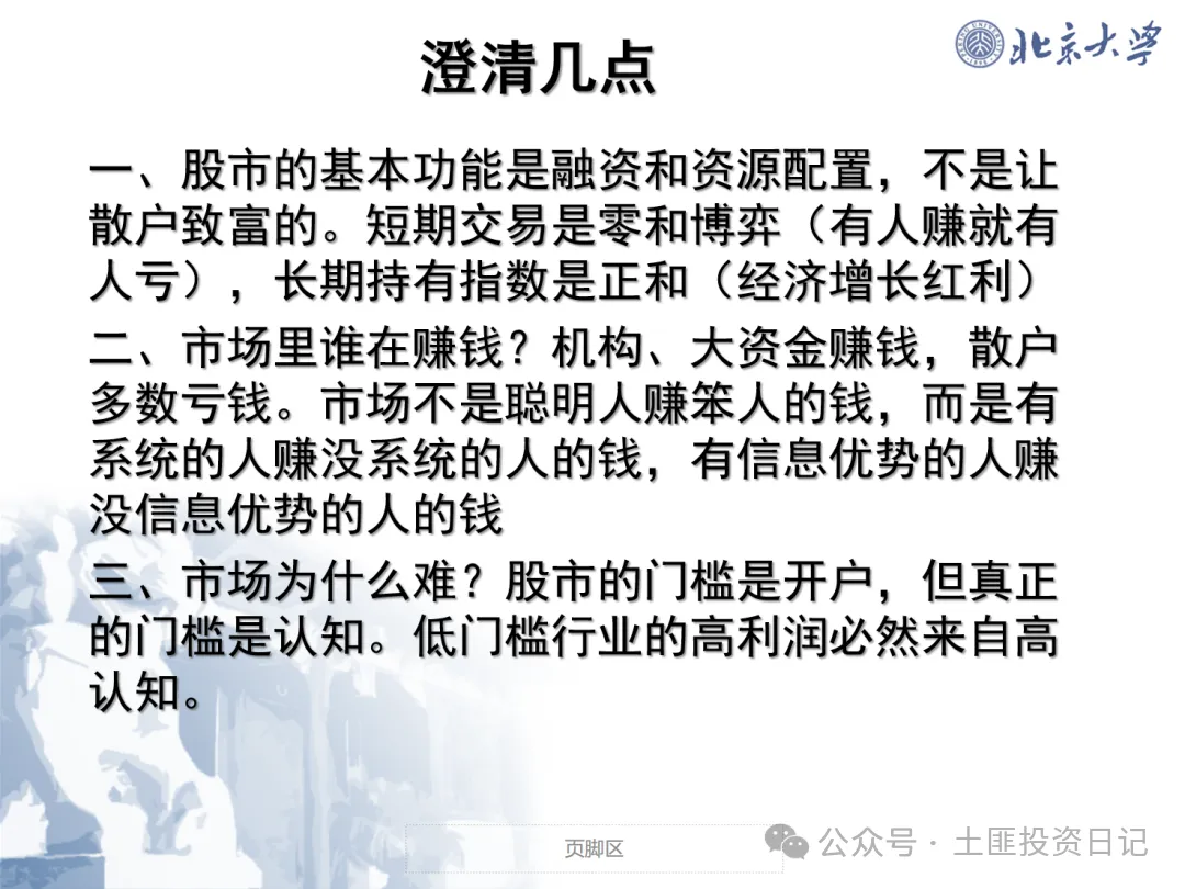 - 利益格局:机构、大资金赚钱,散户多数亏钱;有系统的人赚没系统的人的钱,有信息优势的人赚没信息优势的人的钱