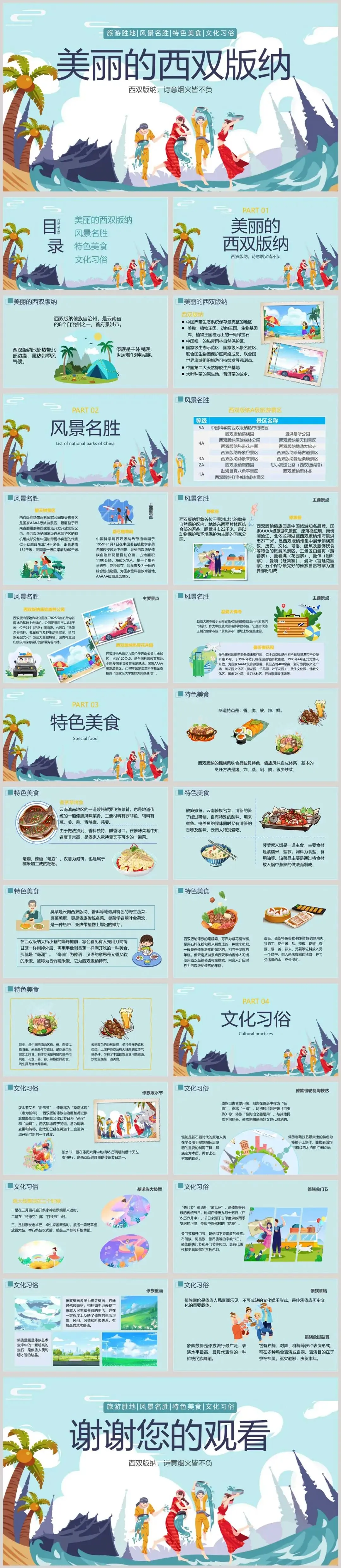 这是一套青色卡通风格“美丽的西双版纳”城市介绍旅游推介PPT模板,共26页;