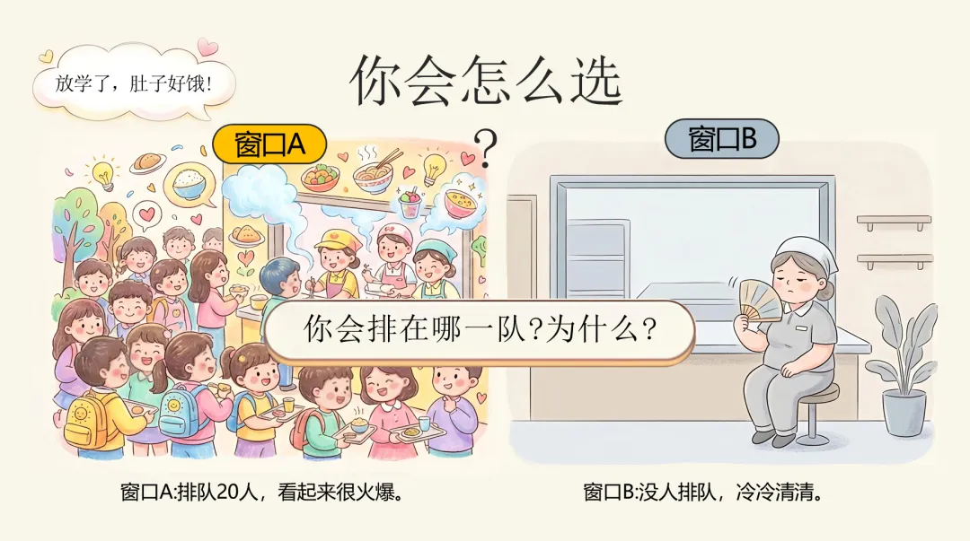 很多同学选了A,对吧?其实这很正常。因为我们都觉得:“那么多人选,肯定好吃。”