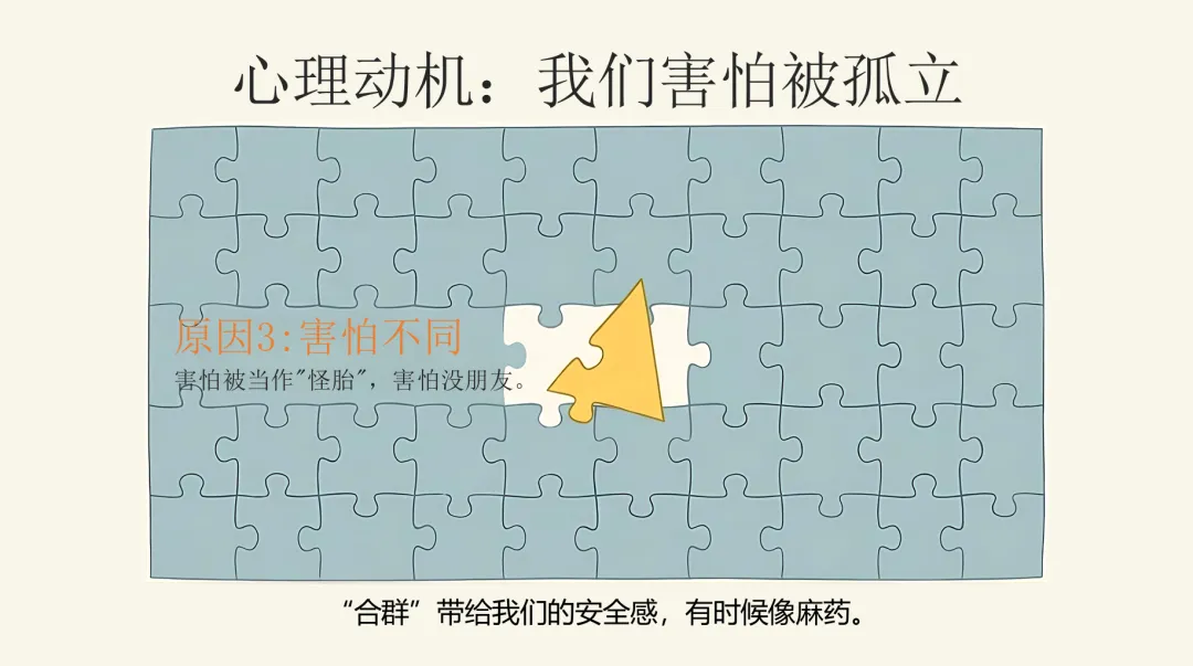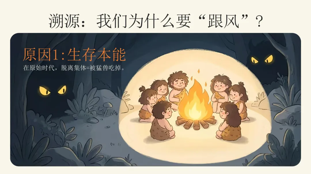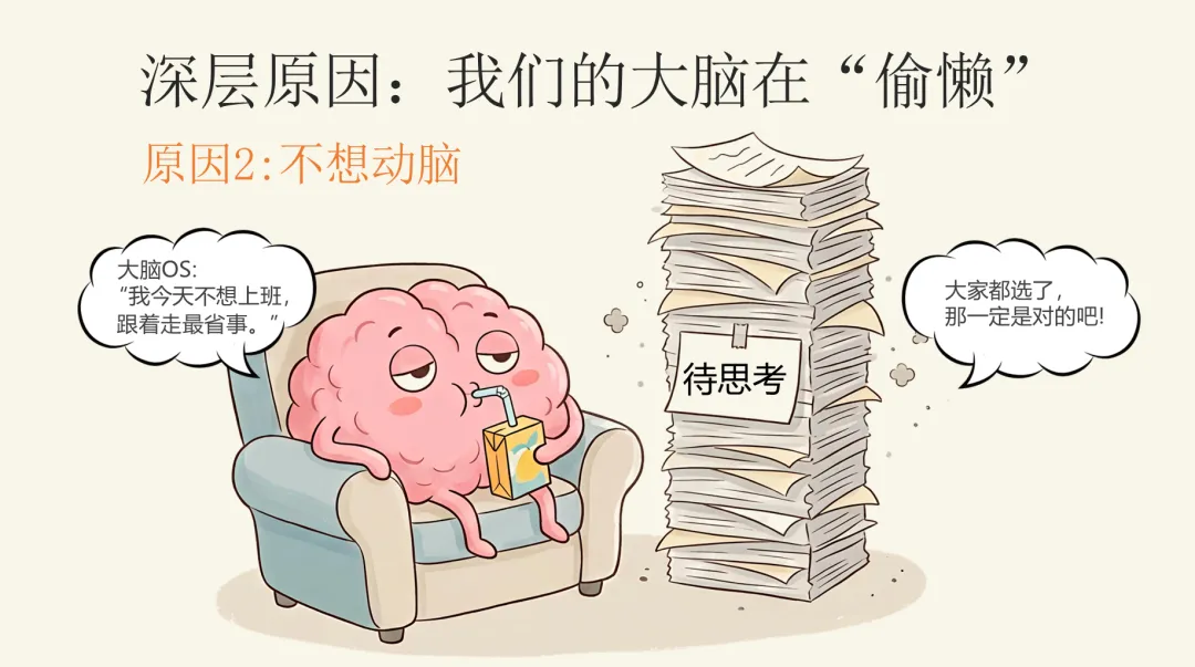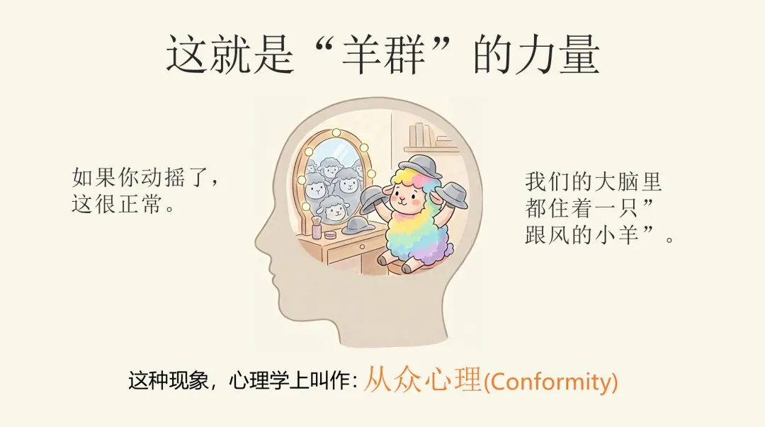 我们每个人大脑里,都住着一只“跟风的小羊”。它不是坏东西,它来自我们的生存本能:在远古时代,脱离集体就可能被猛兽吃掉。所以“跟着大家一起走”,曾经是保命的技能。