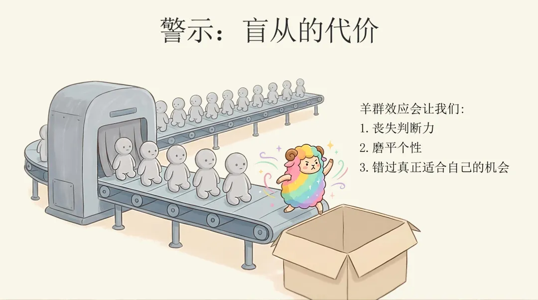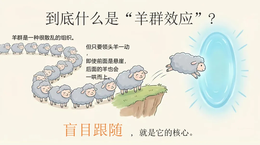 这就是“羊群效应”——盲目跟随,不动脑子。