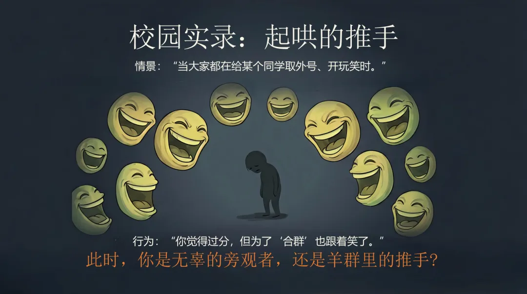有人在给同学取外号、开玩笑,你觉得过分,但为了“合群”,也跟着笑了。