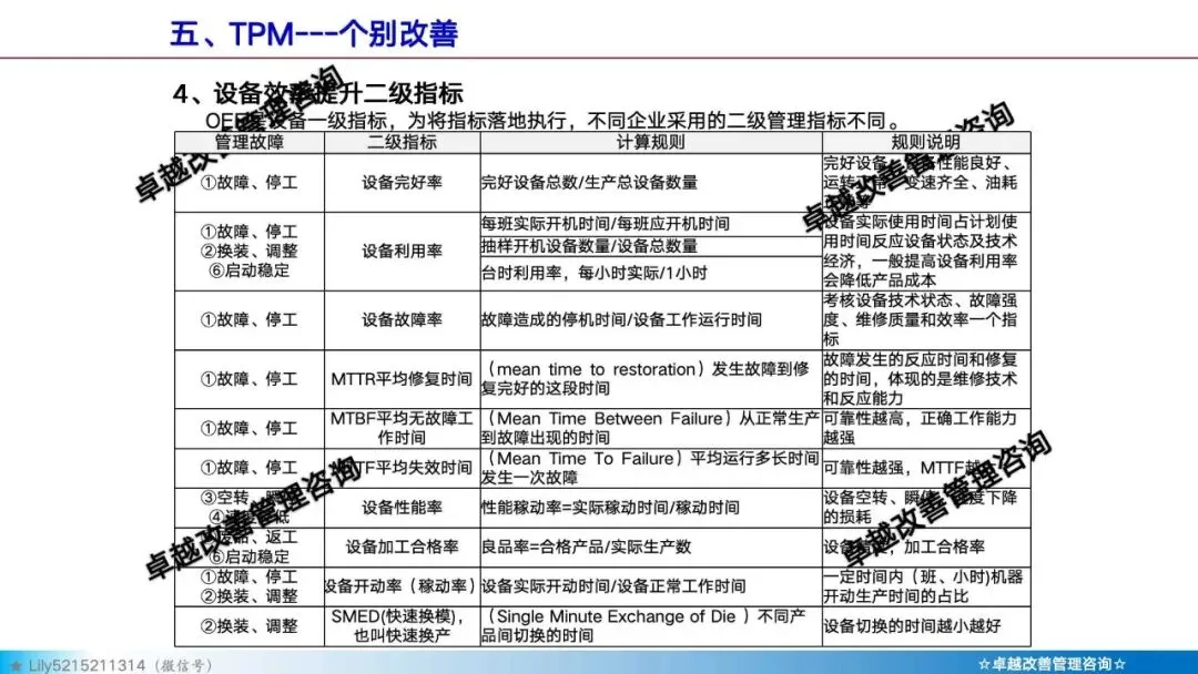 • 确认目标达成:OEE、MTBF、不良率、成本