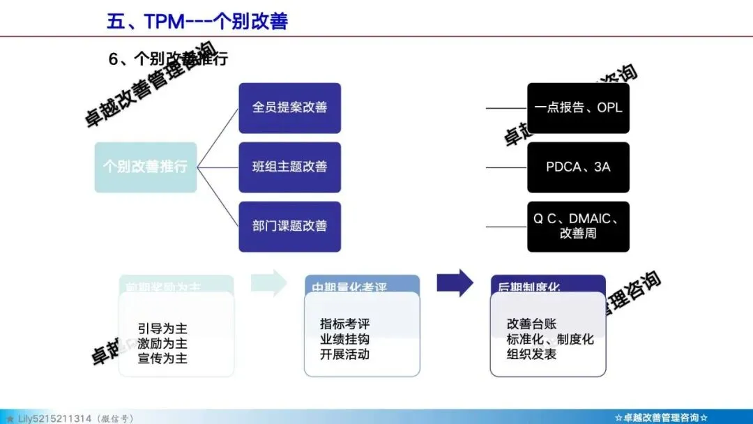 • 个别改善:针对重大顽固课题,立项、定目标、跨部门、按步骤攻克
