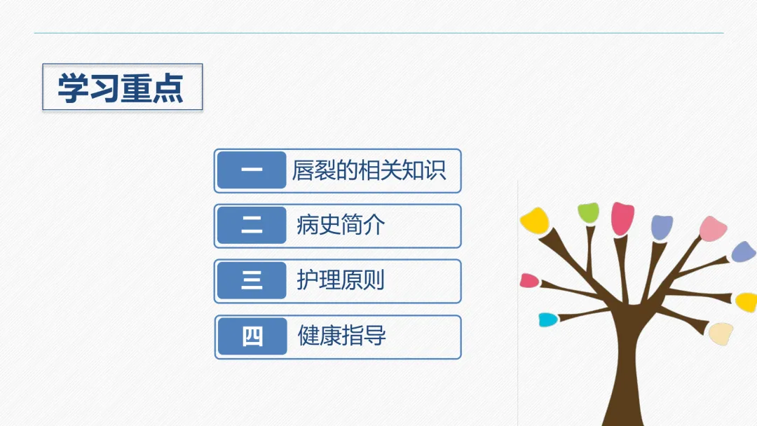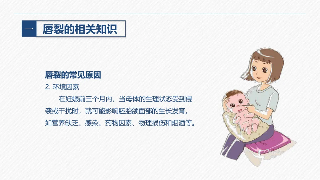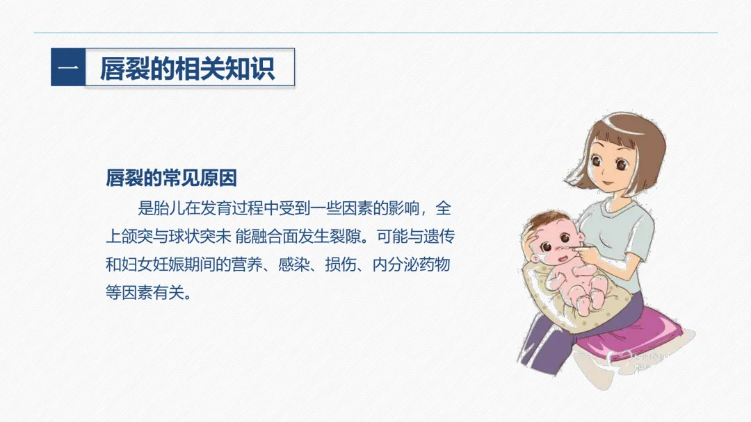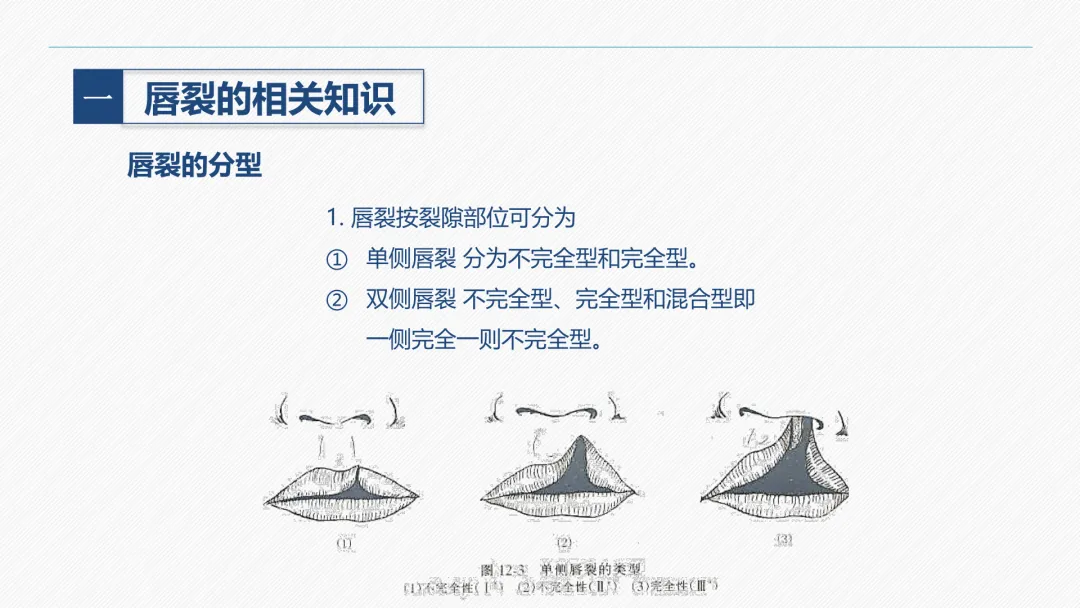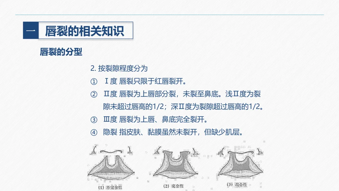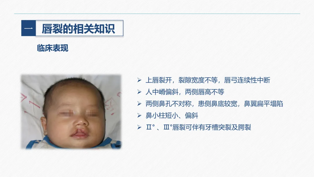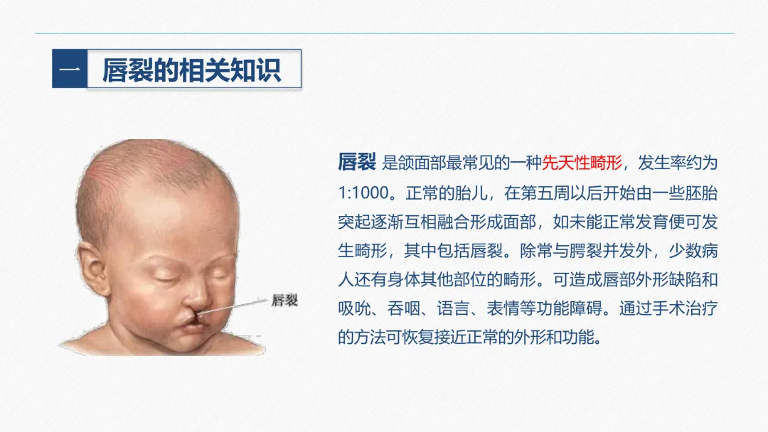 唇裂是颌面部最常见的一种先天性畸形,发生率约为 1:1000。胎儿在第五周以后,胚胎突起逐渐融合形成面部,如未能正常发育便可发生畸形,包括唇裂。唇裂常与腭裂并发,少数合并其他部位畸形,可导致唇部外形缺陷和吸吮、吞咽、语言、表情等功能障碍,通过手术可恢复接近正常的外形和功能。