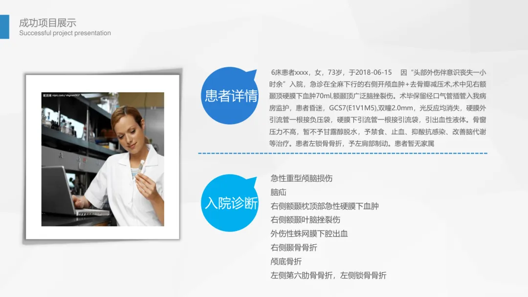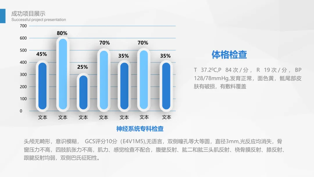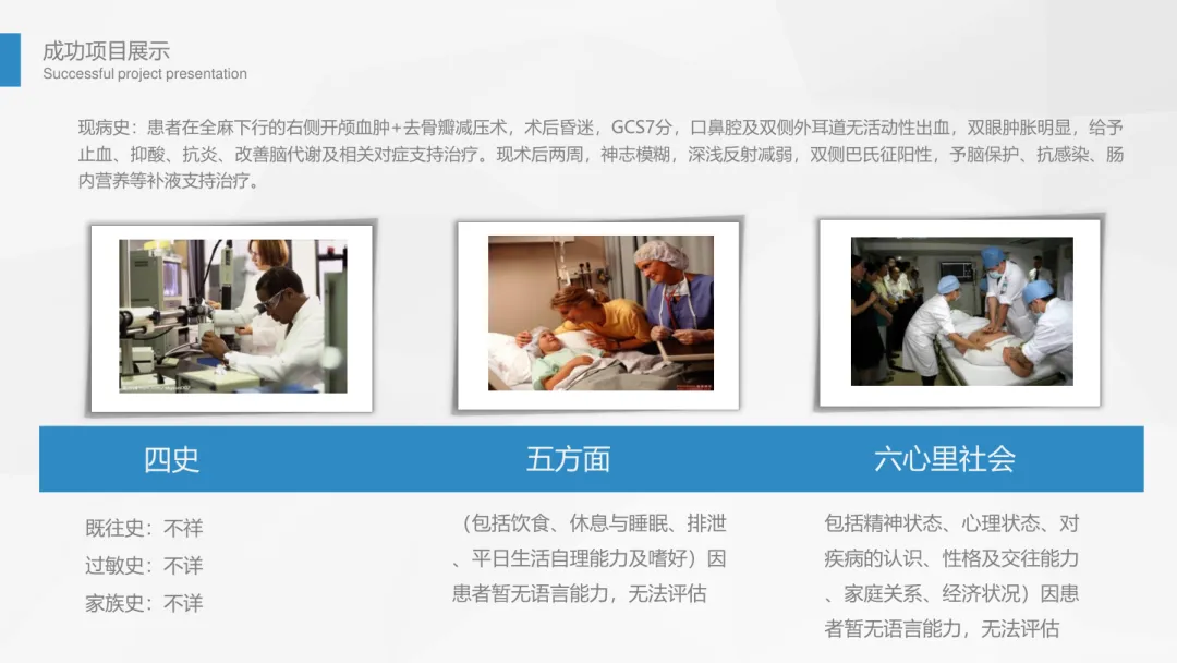 - 现病史:患者全麻术后昏迷,GCS7 分,口鼻腔及双侧外耳道无活动性出血,双眼肿胀明显,予止血、抑酸、抗炎、改善脑代谢及对症支持治疗。术后两周神志模糊,深浅反射减弱,双侧巴氏征阳性,予脑保护、抗感染、肠内营养等补液支持治疗。