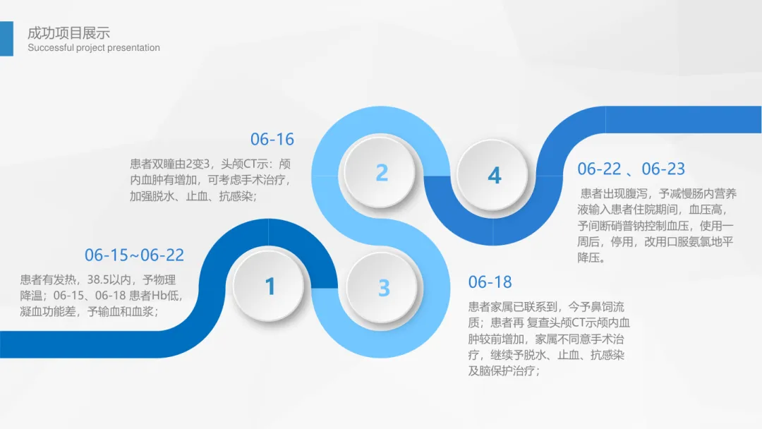 - 06-16:患者双瞳由 2mm 变为 3mm,头颅 CT 示颅内血肿有增加,可考虑手术治疗,加强脱水、止血、抗感染。