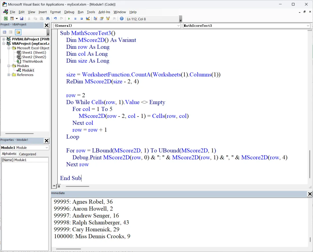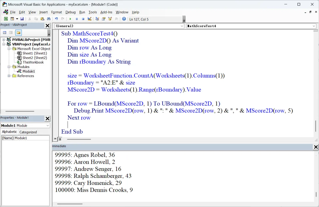 所以,MScore2D 是一个 10 x 5 的二维矩阵。读取 Excel 数据集使用了双重循环:外层是行循环,内层是列循环。我们上面所声明的 MScore2D 是一个固定大小的静态数组,使用我们前面讨论过的动态数组的概念读取整个数据集的代码如图2所示:关于使用 CountA 方法获取数据集行数的说明,请参考前一篇文章。这里要说明的是,声明多维动态数组,和声明一维动态数组一样,都使用同样的 Dim MyArray() As DataType,只是在使用 Redim 重新定义数组大小时,需要给出各维的上界,譬如 ReDim MScore2D(size - 2, 4)。接下来,使用双重循环读取整个 Excel 数据集。只不过这里的外层循环使用 Do While ... Loop 结构,以单元格的值是否为空来判断循环何时结束。内层循环,因为列数已知,所以使用 For ... Next 结构。不过,这里因为整个数据集的行数已经通过 CountA 获知,所以外层循环也可以使用 For ... Next 结构。我们可以把上面的循环代码重写如下:For row = 2 to sizeFor col = 1 to 5MScore2D(row - 2, col - 1) = Cells(row, col)Next colNext row