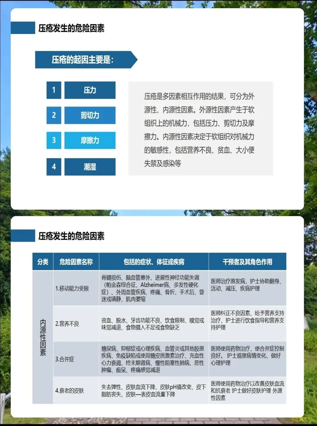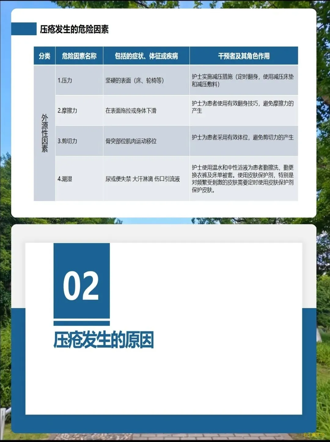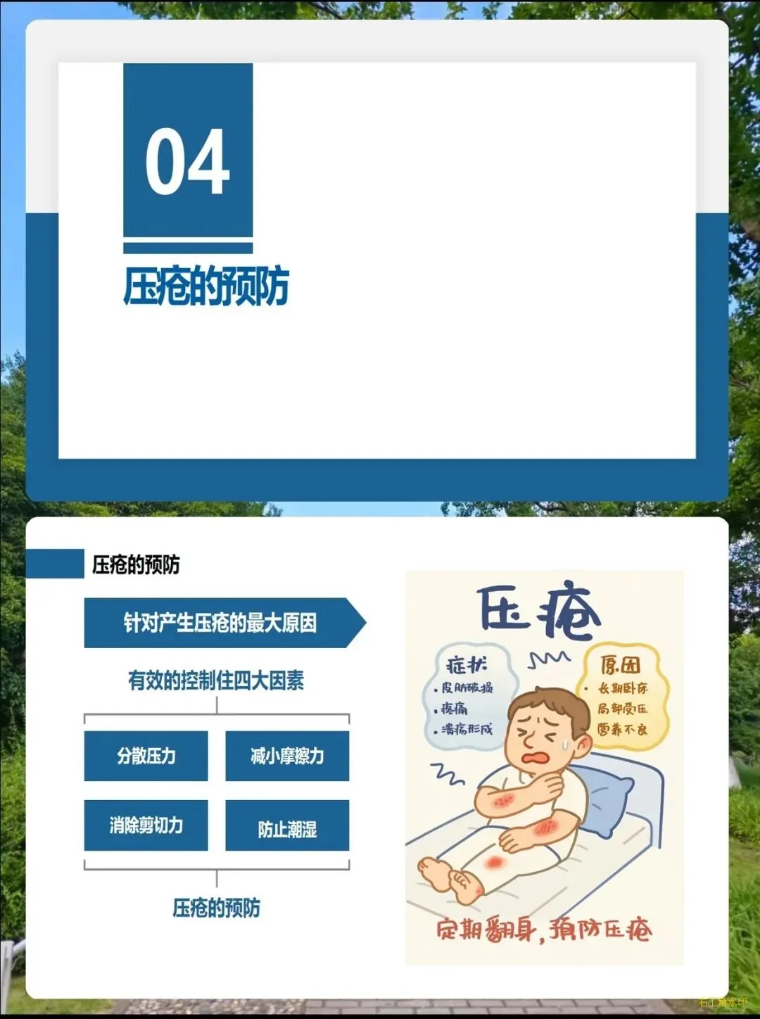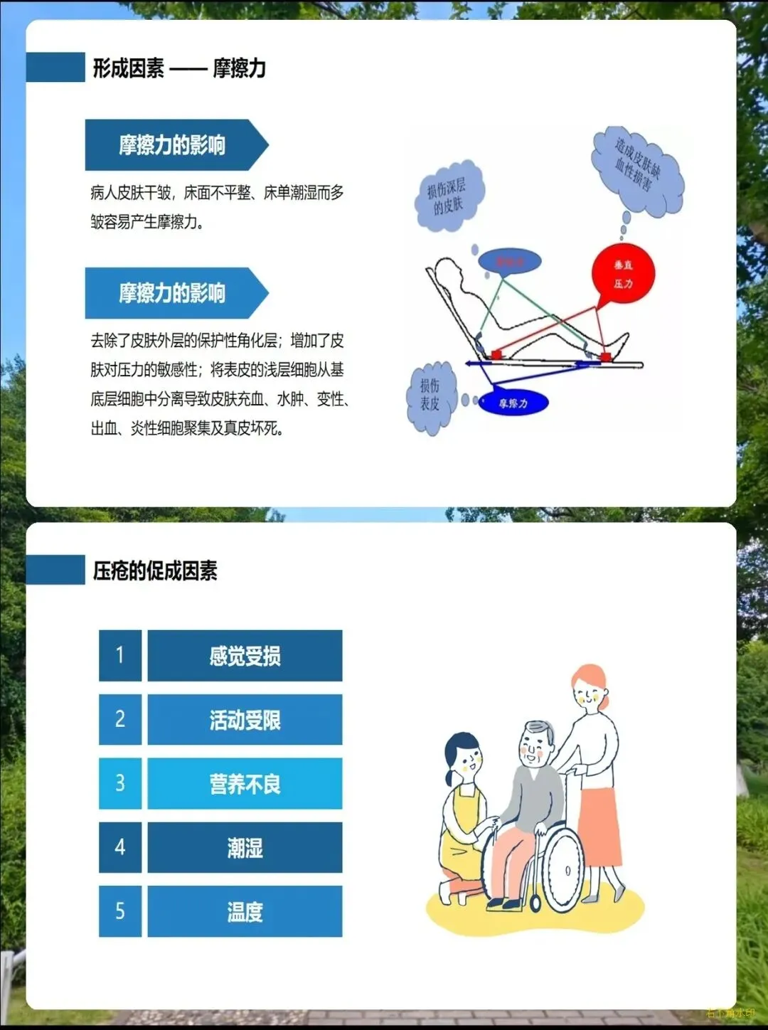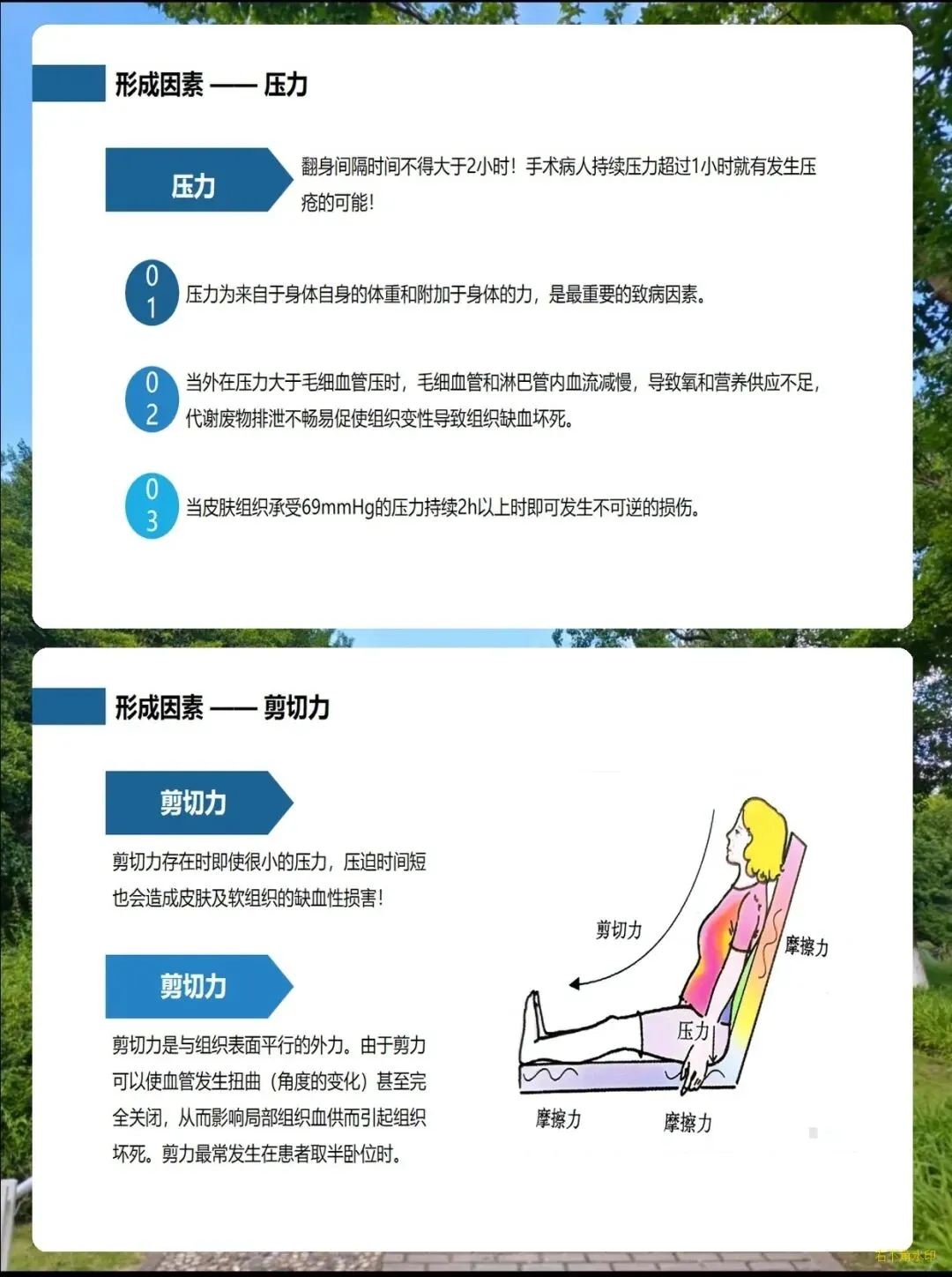 它的发生主要和几个核心因素有关:首先是压力,一个部位持续受压超过2小时就可能出现不可逆的损伤,手术患者受压1小时就有患病风险;其次是摩擦和剪切力,比如躺卧时身体下滑、在床上拖拉挪动病人,都会悄悄损伤皮肤;