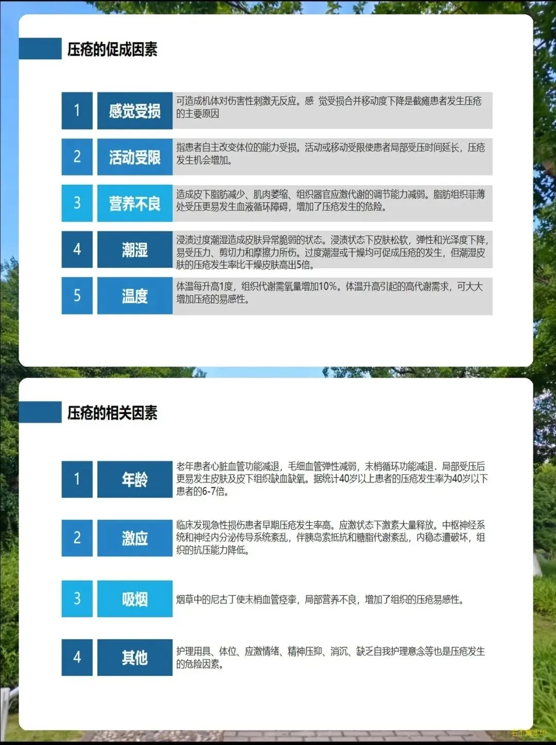 第三是潮湿,出汗、大小便没及时清理,皮肤长期处于浸渍状态,长压疮的概率比干燥皮肤高出5倍,另外营养不足、吸烟、体温升高也会进一步增加患病风险。