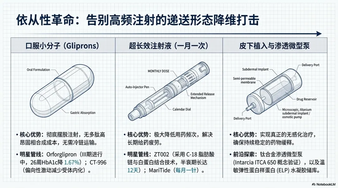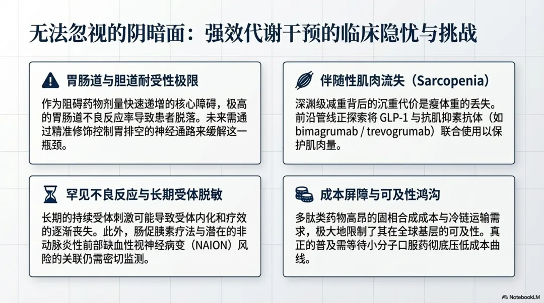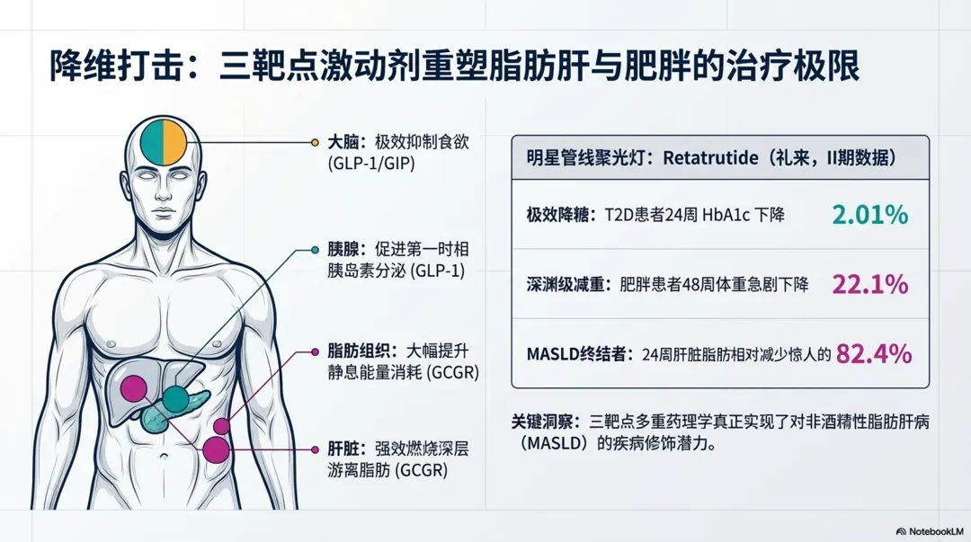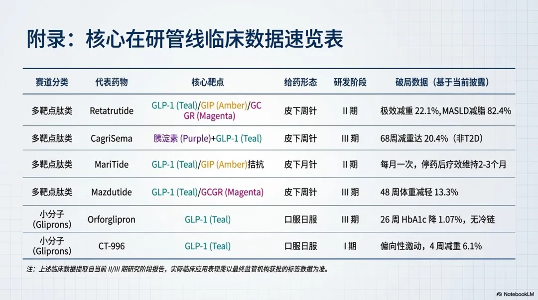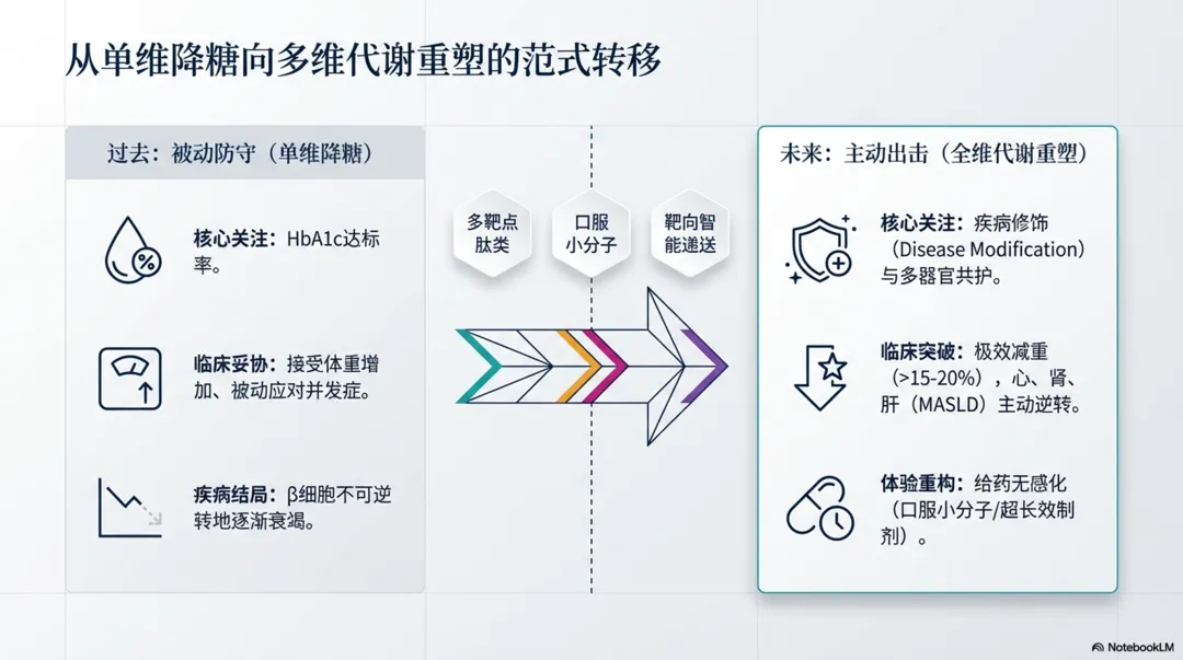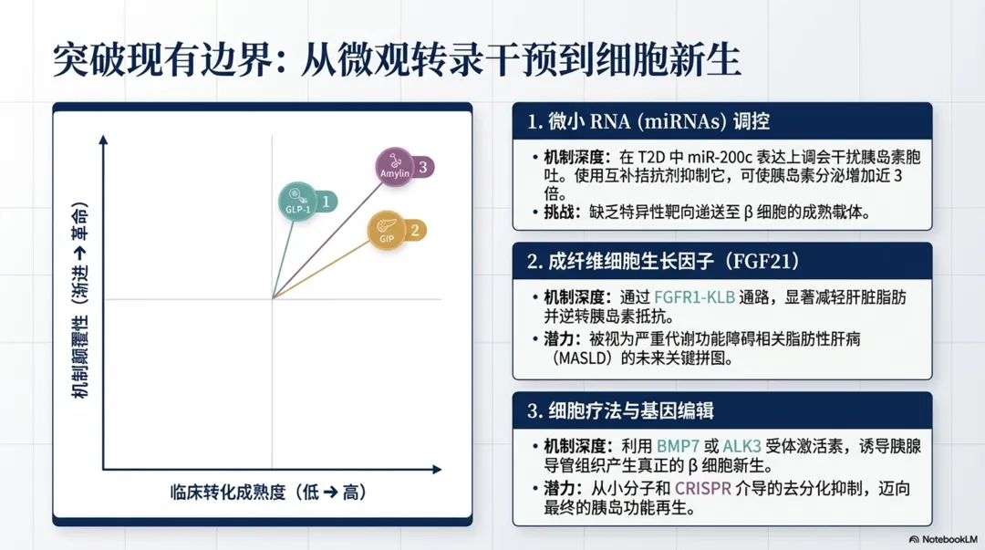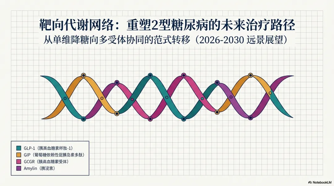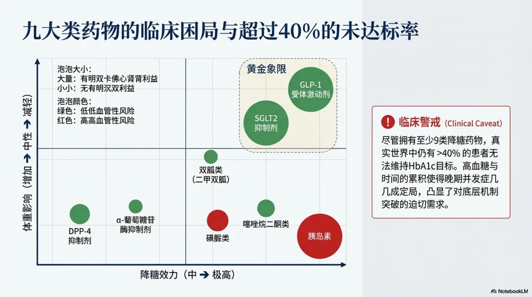 图片摘要↑:2型糖尿病药物治疗的前沿动态,重点关注旨在解决现有疗法局限性的新型非胰岛素类药物。内容包括分析多受体激动剂的兴起,尤其是结合了肠促胰素与胰淀素机制的合成肽,这类药物在降糖与减重方面表现出卓越的双重效能。除已有的口服及注射药物,还梳理小分子GLP-1受体激动剂、线粒体调节剂以及基因编辑等尚处于研发阶段的创新疗法。需要强调,理想的未来方案应在强效控糖的同时,兼顾心肾保护、体重管理及良好的安全性。尽管新技术的临床转化面临脱靶效应和高昂成本等挑战,但精准医疗与多靶点干预已成为重塑糖尿病管理模式的核心趋势。最终呼吁,在期待科技突破的同时,仍需优化现有药物组合以有效预防并发症。PPT l 2026CK