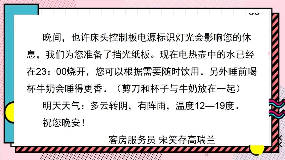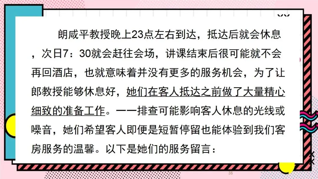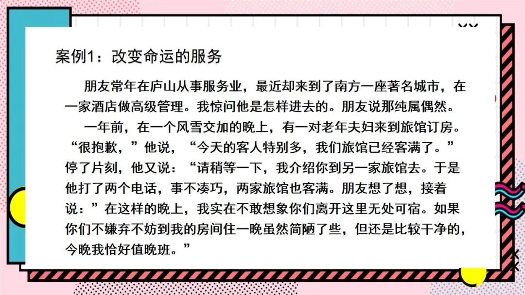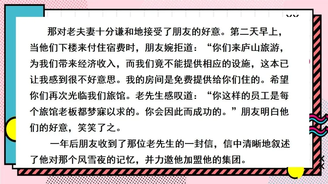 那对老夫妻十分谦和地接受了朋友的好意。第二天早上,当他们下楼来付住宿费时,朋友婉拒道:“你们来庐山旅游,为我们带来经济收入,而我们竟不能提供相应的设施,这本已让我感到很不好意思。我的房间是免费提供给你们住的。希望你们再次光临我们旅馆。老先生感叹道:“你这样的员工是每个旅馆老板都梦寐以求的。你会因此而成功的。”朋友明白他们的好意,笑笑了之。