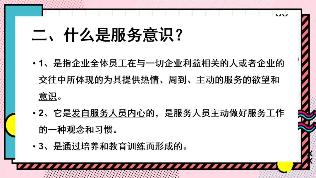 1.是指企业全体员工在与一切企业利益相关的人或者企业的交往中所体现的为其提供热情、周到、主动的服务的欲望和意识。