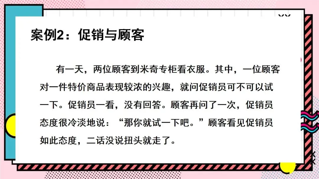 有一天,两位顾客到米奇专柜看衣服。其中,一位顾客对一件特价商品表现较浓的兴趣,就问促销员可不可以试一下。促销员一看,没有回答。顾客再问了一次,促销员态度很冷淡地说:“那你就试一下吧。”顾客看见促销员如此态度,二话没说扭头就走了。