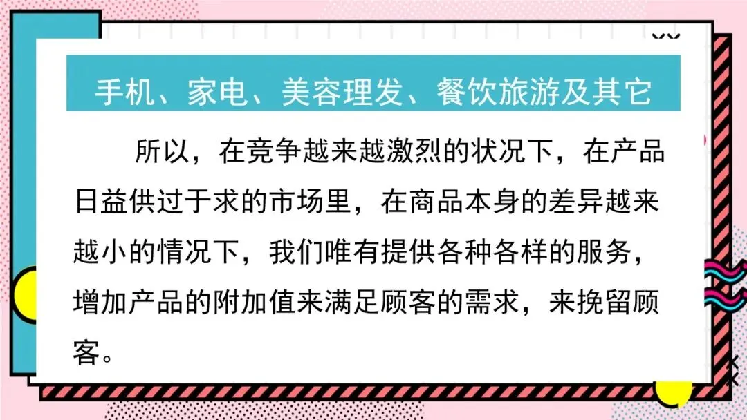 所以,在竞争越来越激烈的状况下,在产品日益供过于求的市场里,在商品本身的差异越来越小的情况下,我们唯有提供各种各样的服务,增加产品的附加值来满足顾客的需求,来挽留顾客。