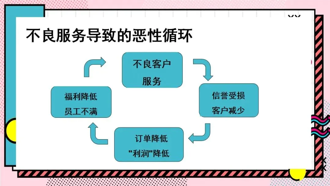 不良客户服务导致信誉受损客户减少,影响订单降低"利润"降低,福利降低员工不满。
