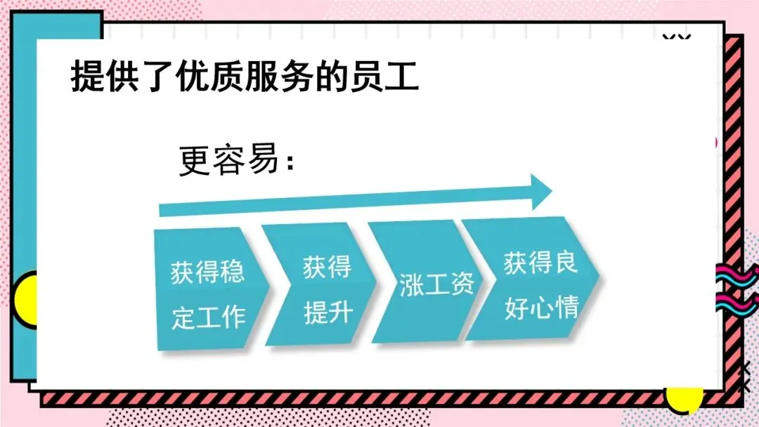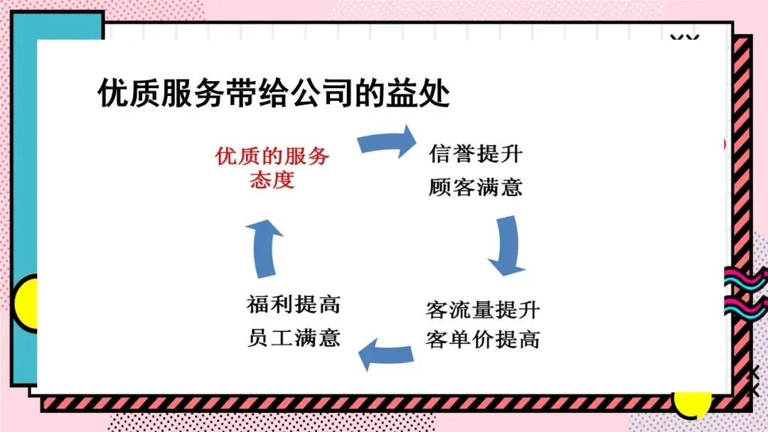 优质的服务态度可以提升信誉,让顾客满意,从而客流量提升,客单价提高,这样能提高员工福利,提升员工满意度。