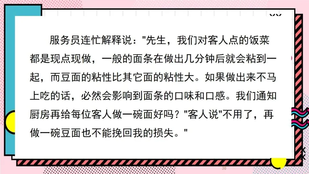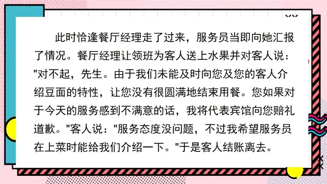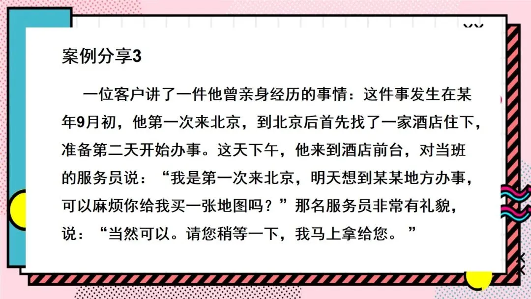 一位客户讲了一件他曾亲身经历的事情:这件事发生在某年9月初,他第一次来北京,到北京后首先找了一家酒店住下,准备第二天开始办事。这天下午,他来到酒店前台,对当班的服务员说:“我是第一次来北京,明天想到某某地方办事,可以麻烦你给我买一张地图吗?”那名服务员非常有礼貌,说:“当然可以。请您稍等一下,我马上拿给您。 ”