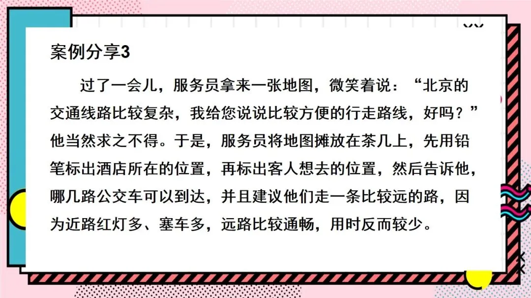 过了一会儿,服务员拿来一张地图,微笑着说:“北京的交通线路比较复杂,我给您说说比较方便的行走路线,好吗?”他当然求之不得。于是,服务员将地图摊放在茶几上,先用铅笔标出酒店所在的位置,再标出客人想去的位置,然后告诉他,哪几路公交车可以到达,并且建议他们走一条比较远的路,因为近路红灯多、塞车多,远路比较通畅,用时反而较少。