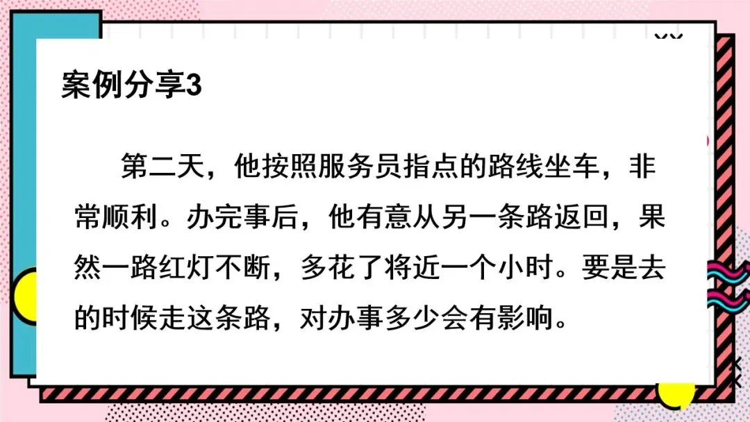 第二天,他按照服务员指点的路线坐车,非常顺利。办完事后,他有意从另一条路返回,果然一路红灯不断,多花了将近一个小时。要是去的时候走这条路,对办事多少会有影响。